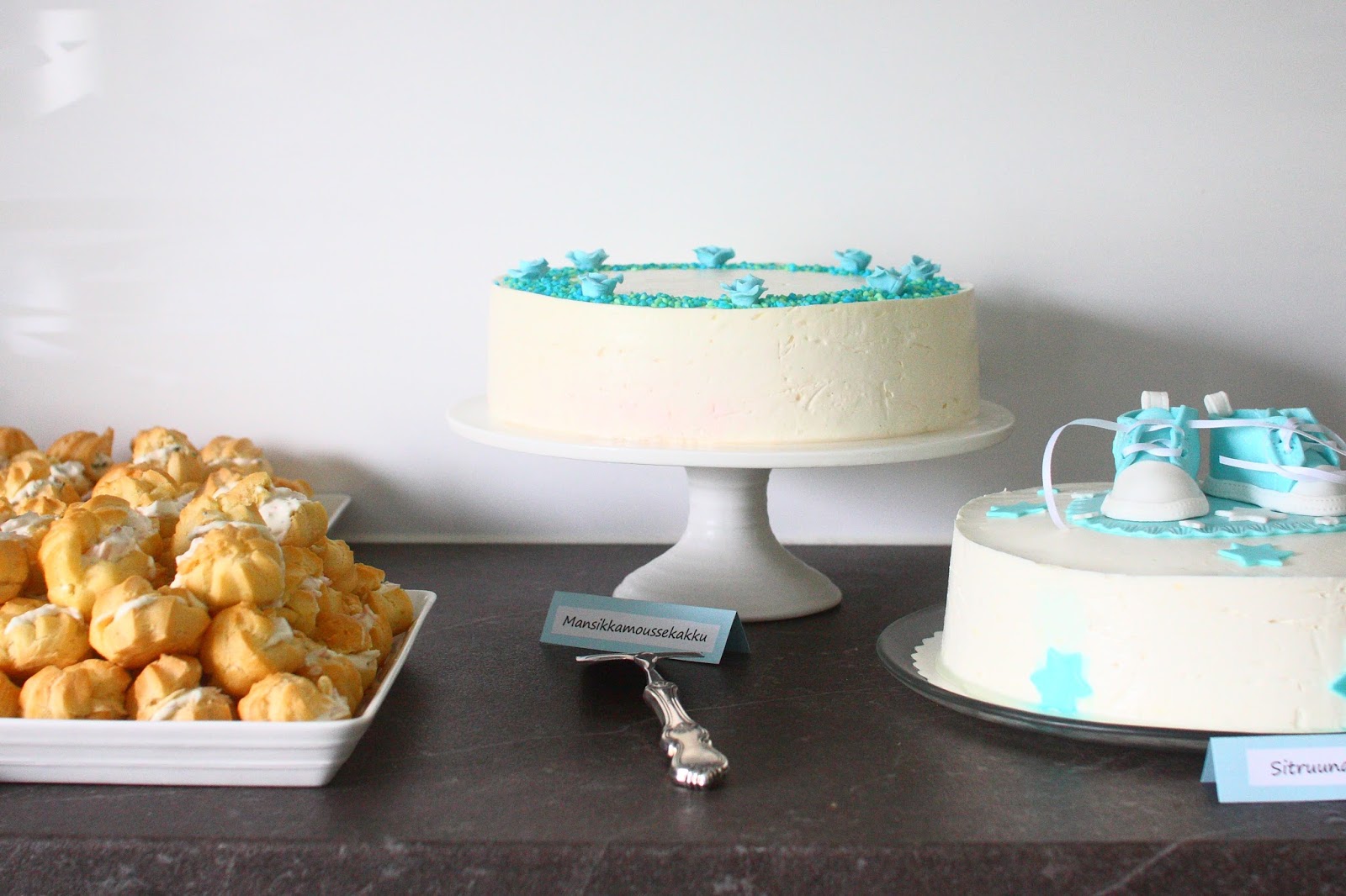 Tässä vielä yhteenveto poikamme ristiäisten tarjottavista 🙂 Juhlissa oli paikalla 14 aikuista ja 9+1 lasta, ja pöydästä löytyi sekä suolaista että makeaa koko poppoolle. Alunperin ajatukseni oli tehdä vain muutama leivonnainen, mutta kuten yleensä, leipominen hieman pääsi käsistä ja pöydästä löytyi pari kakkua suunniteltua enemmän 😉 Tällä kertaa tosin syynä suurempaan määrää tarjottavia oli leipomisinnostuksen sijasta jatkuvat epäonnistumiset ja ulkonäöllisesti täydellisen (ja kuitenkin pakastettavan) kakun metsästys. Mutta eipä siinä mitään, nyt päästiin maistelemaan paljon erilaisia juttuja, nams!