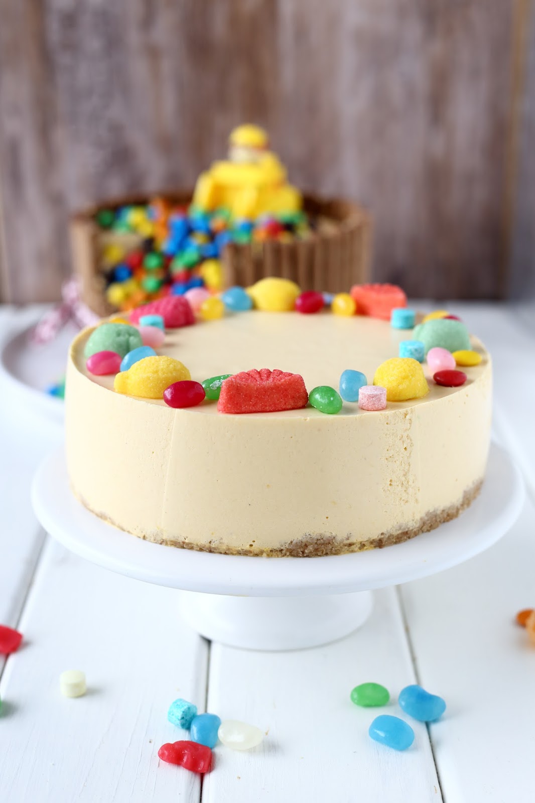 Koristele kakku karkeilla juuri ennen tarjoilua, etteivät namit sula kakun pintaan.