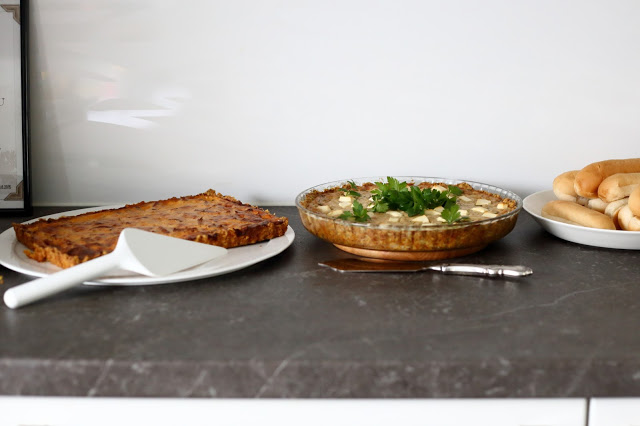 Tein tytön ensimmäisille synttäreille suolaisiksi tarjottaviksi kaksi piirakkaa. Toinen niistä oli tämä tosi maukas, ihanan suolainen salamipiirakka, joka näkyy kuvassa vasemmalla. Tämän piirakan kuvaamisen kanssa kävi vähän hassusti, sillä en juhlavalmisteluiltani muistanut/ehtinyt ottamaan valmiista piirakasta kuin tämän yhden kuvan. Samassa kuvassa näkyykin sitten muita suolaisia tarjottavia, elikkä keskellä toinen herkullinen suolainen piirakka, jonka ohje on tulossa blogiin ihan justiinsa. Ihan tuolla oikeassa reunassa vilkahtaa hod doggien sämpylät. Pitihän ryhmähau-juhlissa olla jotain muutakin koiraan viittavaa kuin pelkkä kakku 😉