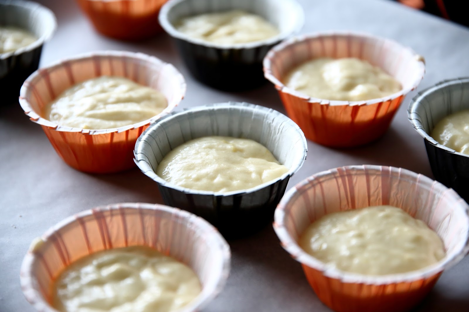 Vinkki: * Taikinassa on suht reilusti nostatusaineita, ja taikina alkaakin toimia eli kuplia heti pian sekoittamisen jälkeen. Älä enää sekoittele tämän jälkeen lisää, vaan kauho taikinaa vuokiin, noin puoleen väliin asti.