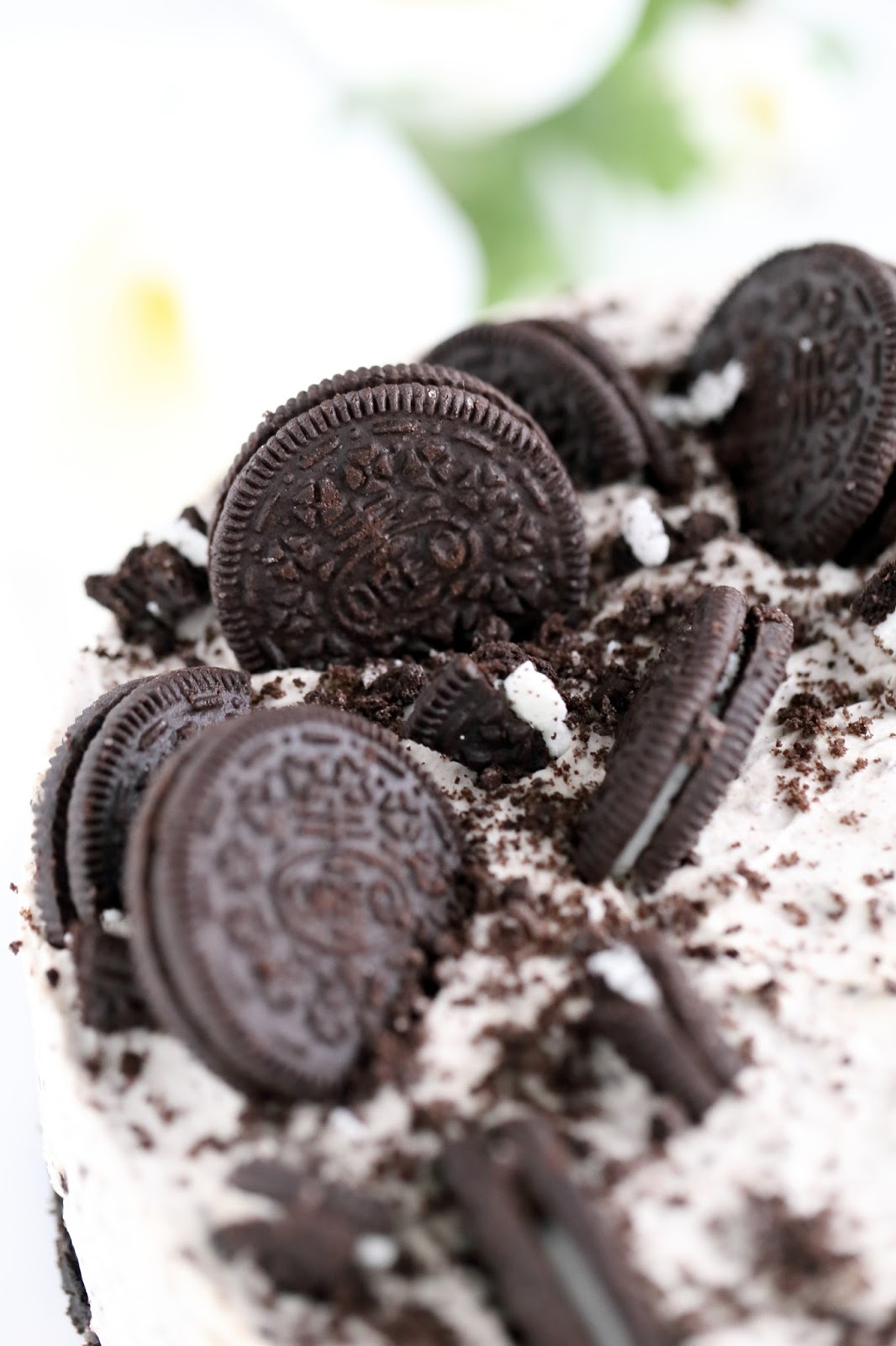 Murskaa pohjaa varten 200 g Oreokeksejä vaikkapa tehosekoittimessa. Lisää maitoa vähitellen n. 2 rkl, kunnes keksimurska alkaa pysyä koossa, kun niitä puristaa kämmenessä. Laita n. 20 cm vuoan irtoreuna tarjoilulautaselle ja laita sisäpuolelle reunakalvot tms. Voitele kalvot. Tämä auttaa kakkua irtoamaan nätisti. Painele keksiseos tarjoilulautaselle vuoan reunojen sisäpuolelle. Laita tarjoilulautanen jääkaappiin täytteen teon ajaksi. Vatkaa vispikerma vaahdoksi. Lisää joukkoon tuorejuusto, mascarpone sekä sokerit. Vatkaa kunnolla sekaisin. Pilko n. 150 g Oreokeksejä n. 1.5 cm x 1.5 cm kokoiseksi murskaksi. Lisää täytteen joukkoon.