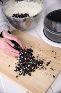 En ehtinyt katsoa netistä tarkempia ohjeita, joten sävelsin omanlaisen version. Muihin Oreo-juustokakkujen ohjeisiin verrattuna tämä on varmaan aika lähellä. Ainakin siltä osin, että pohjaan tulee Oreo-keksejä ja täytteeseen kermaa, tuorejuusto sekä keksejä. Täytteeseen hukkasin myös sen kaapissa lojuneen mascarponen. Pohjan tein taas ilman ylimääräistä rasvaa eli sekoittamalla keksimurun joukkoon maitoa. Toimii!
