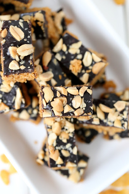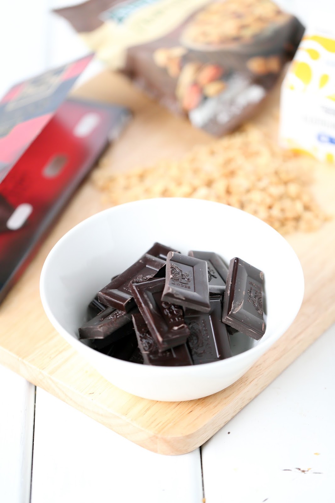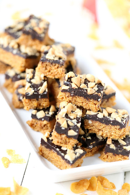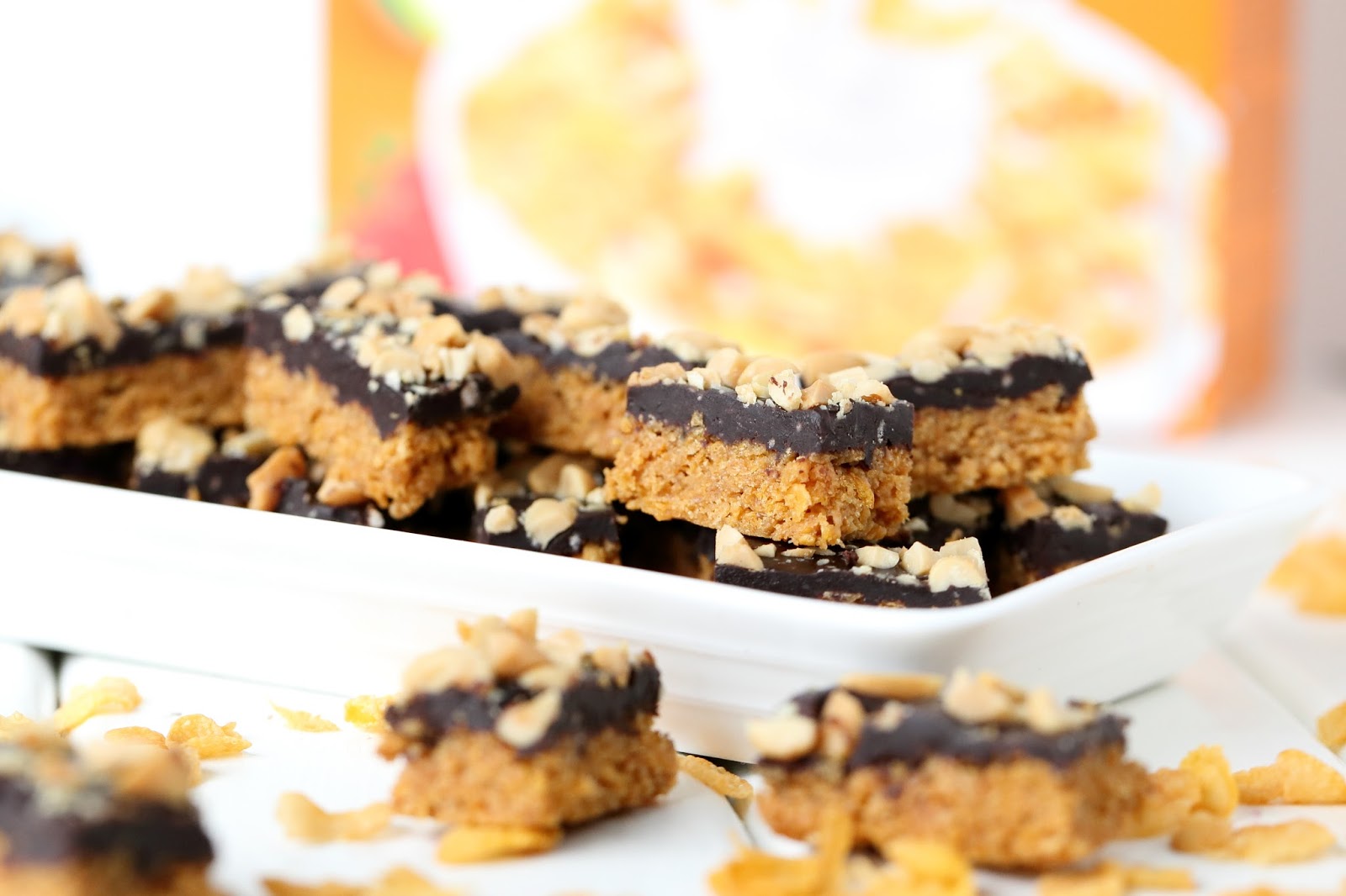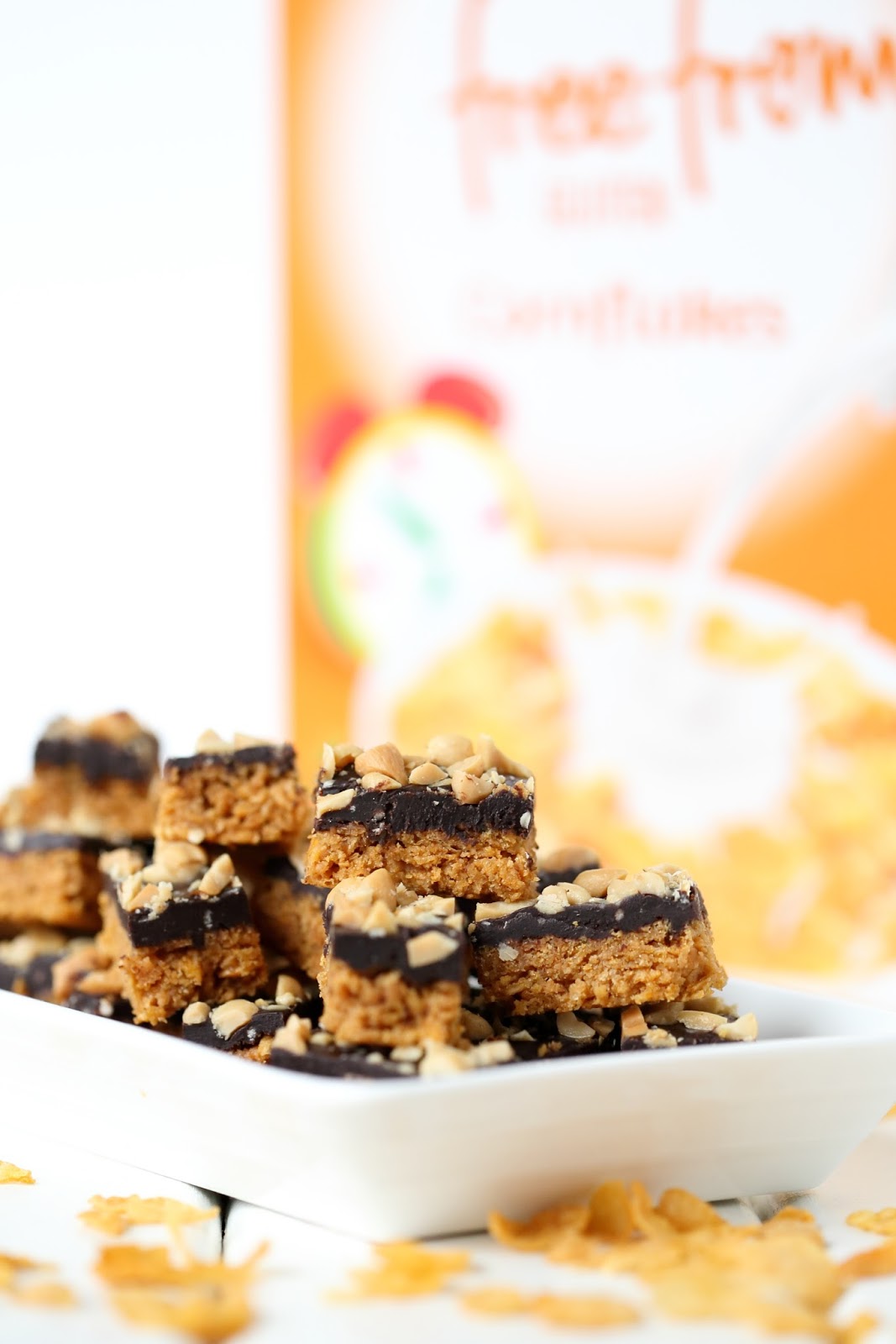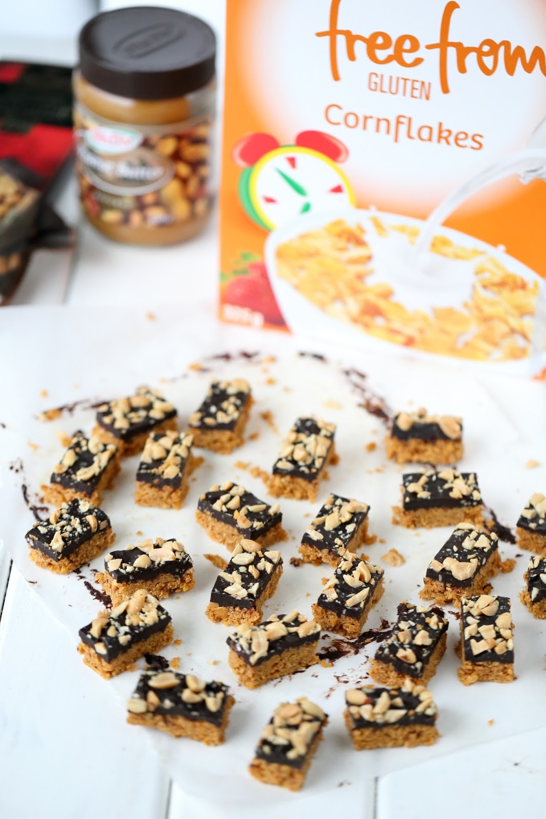 Maissihiutaleita voi käyttää vaikkapa helppoihin, uunittomiin, rapeisiin maapähkinäkekseihin, joiden päällä on paksuhko kerros tummaa pehmeähköä suklaaganachea. Kokonaisuuden kruunaa suolapähkinät. Rapeita, ei liian makeita. suklaisia pikkupaloja 🙂