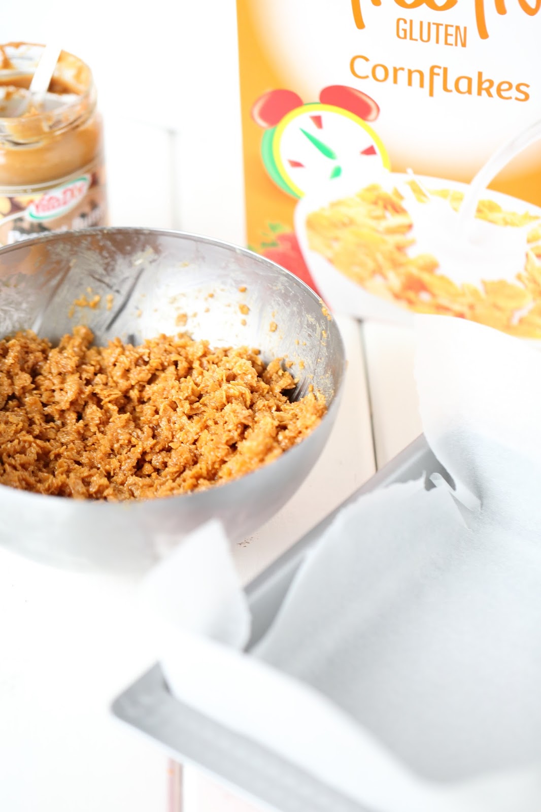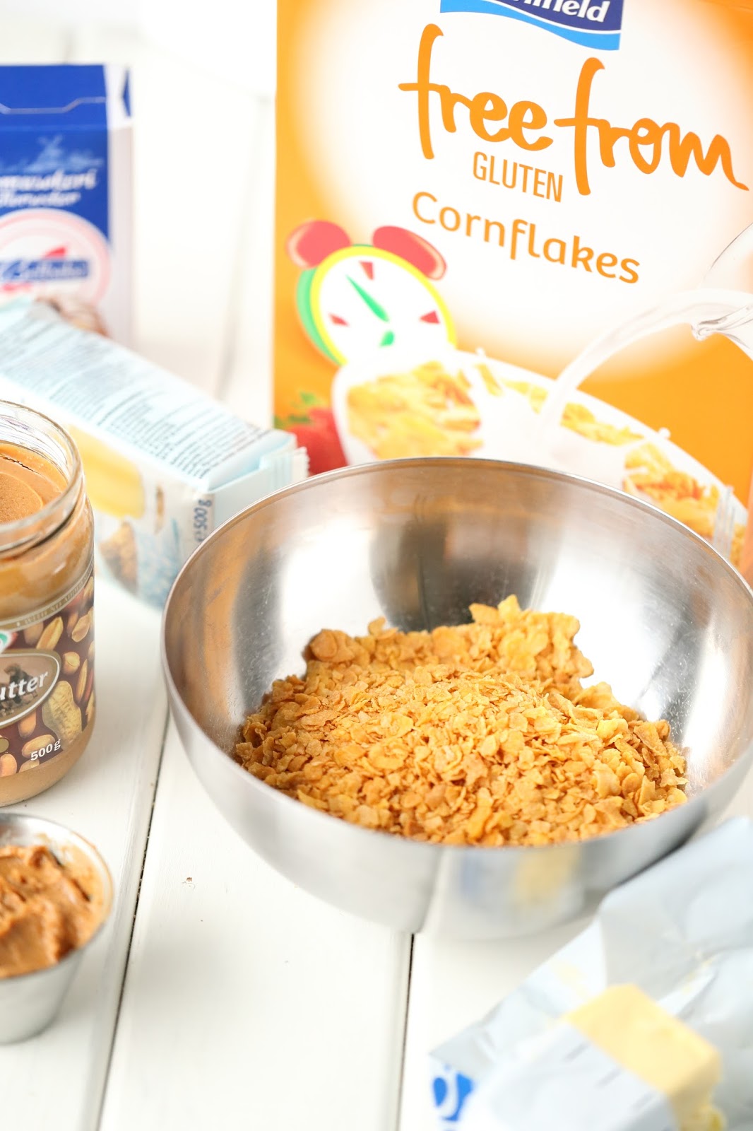 Suolakeksien ja valmiin brownies-jauhoseoksen lisäksi halusin maistella ja leipoa jotain pientä Free From Gluten maissihiutaleista. Kuten arvata saattoi, maultaan ja koostumukseltaan ne ovat kuin tavallisia maissihiutaleita. Maissihiutaleet ovat monipuolisia (eivät siis vain aamu- tai välipala -muonaa), ja ne ovat mainio tuote myös leivontaan, kun halutaan saada vaikka jotain makeaa hyvää.