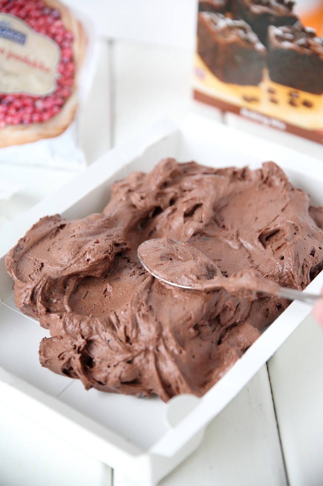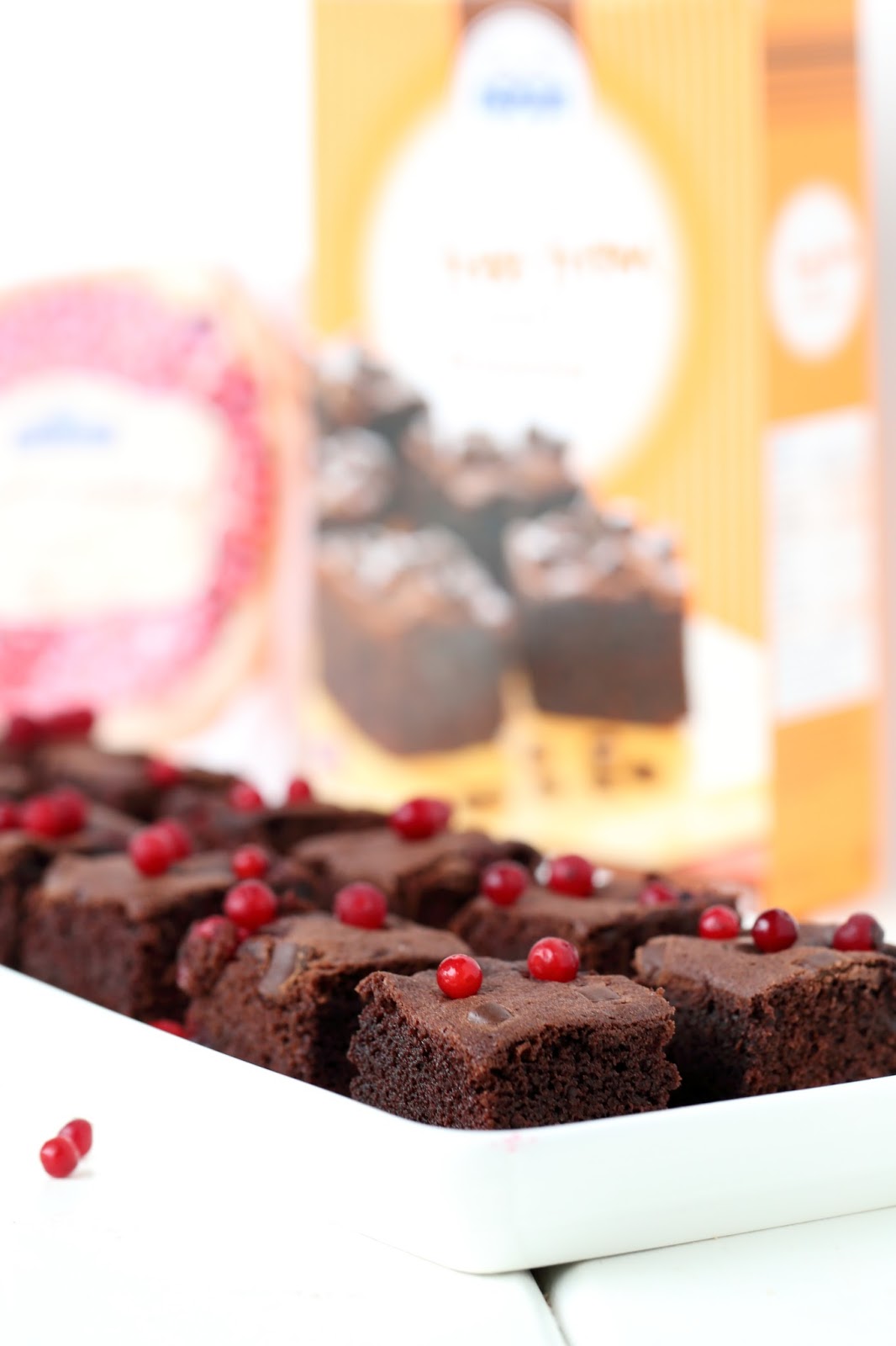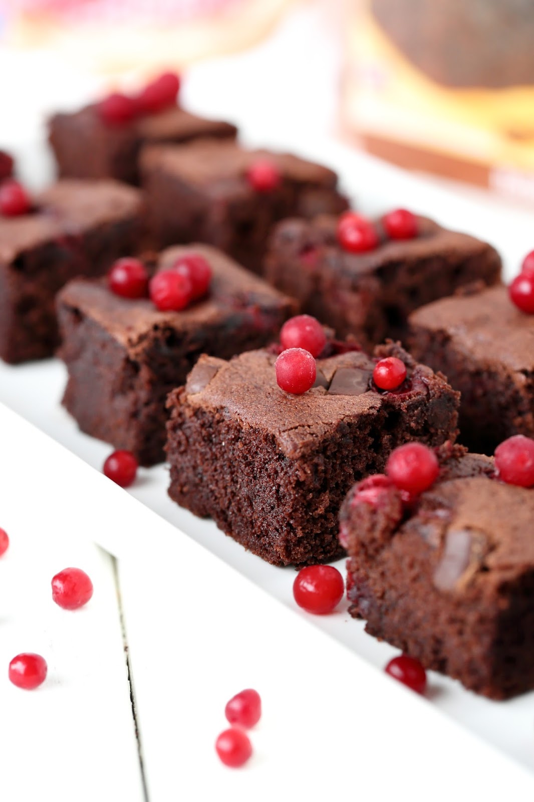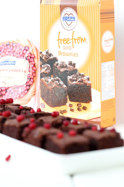 Kuten kuvistakin huomaan, tapani mukaan en malttanut pitää näppejäni erossa tästä Brownies -taikinasta, vaan ujutin joukkoon myös puolukoita. Vaikka brownies olisi toki saanut suosionosoitukset myös ilman ylimääräisiä lisukkeita, niin puolukoilla lopputuloksesta sai hieman jouluisemman. Ja uskokaa tai älkää, mutta puolukka sopii ihan mahdottoman hyvin suklaan kanssa yhteen, nam!