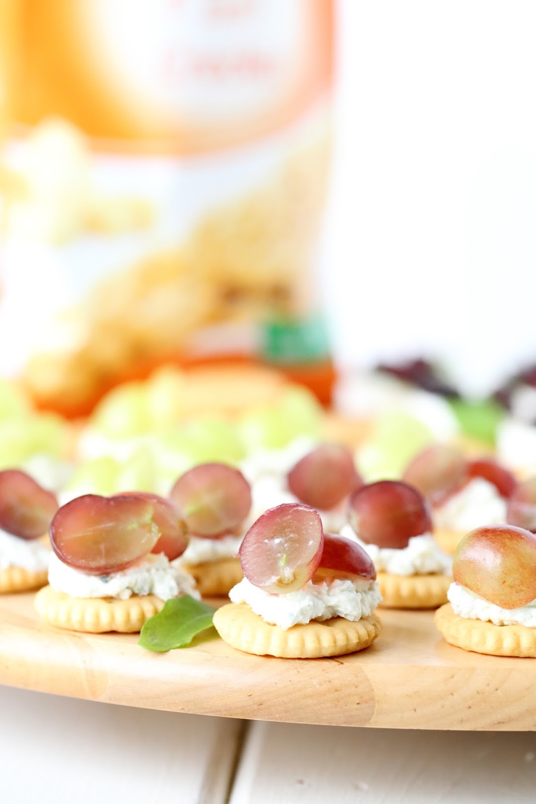 Toinen täyte olikin ehkä aavistuksen klassisempi, nimittäin sinihomejuuston ja viinirypäleen yhdistelmä. Mutta on se vain niin hyvää, että testasin sitäkin osalle kekseistä. Sekoitin murennettua sinihomejuustoa maustamattoman tuorejuuston joukkoon ja levitin tahnan suolakeksien päälle. Päälle vielä puolitettu viinirypäle ja testaus skeptisellä testaajalla. Skeptisyys taittui maistellessa ja sain pyynnön näitä tehdä lisää.