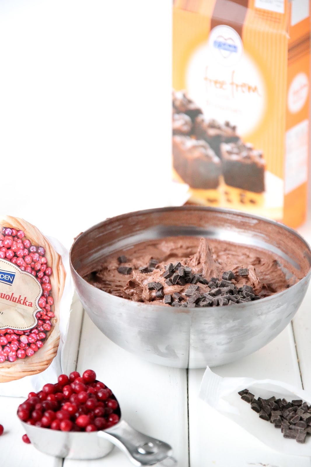 Kokoa pakkauksesta löytyvä pahvinen browniesvuoka vuoassa olevan ohjeen mukaan. Laita kulhoon browniesjauhoseos, voi, maito sekä munat. Sekoita aluksi varovasti, sillä jauhot pöllyävät herkästi. Kun jauhoseos ei enää pöllyä, aloita vatkaamaan kunnolla. Vatkaa seosta parisen minuuttia, kunnes se on kuohkeaa ja vaaleaa. Ota erilleen 1 rkl suklaahippuja, ja lisää loput taikinaan. Lisää joukkoon myös 1 dl puolukoita. Kääntele sekaisin. Levitä taikina pahviseen browniesvuokaan ja tasoita pinta. Ripottele pinnalle loput suklaahiput ja noin 0.5 dl puolukoita.
