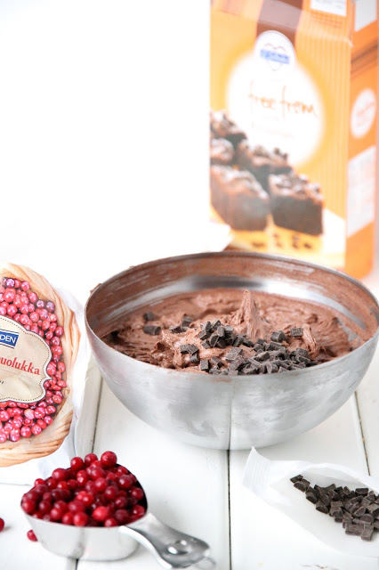 Päälle vielä loput suklaahiput ja lisää puolukoita ja eikun uuniin paistumaan. Jäähdyttelyn jälkeen brownies on valmis nautittavaksi.