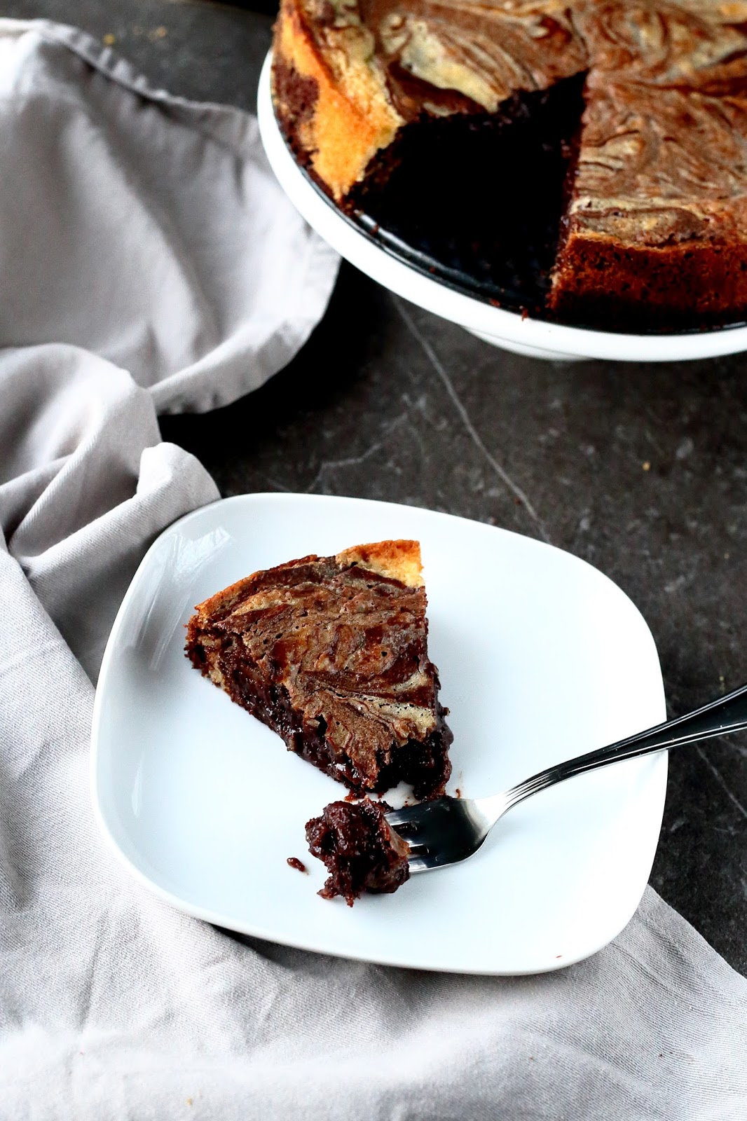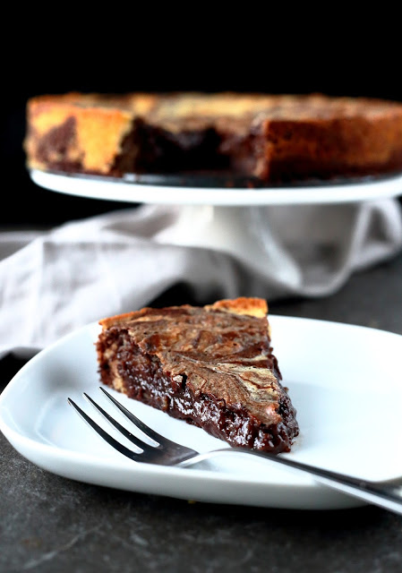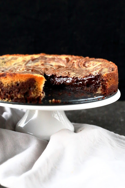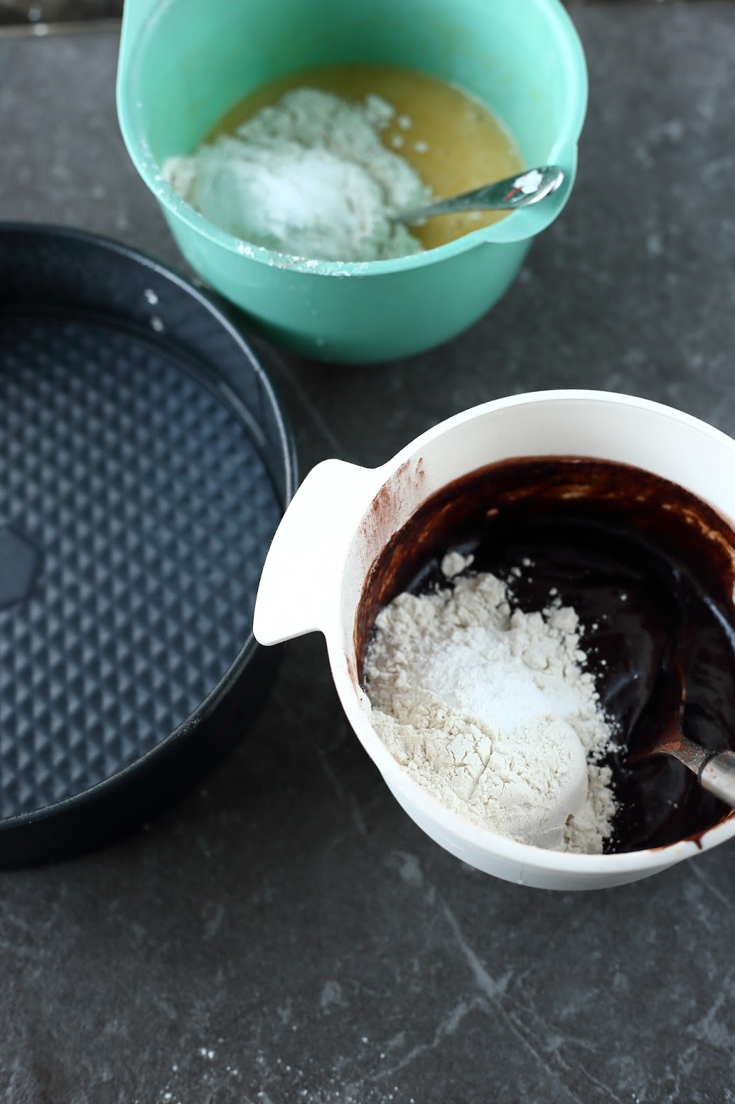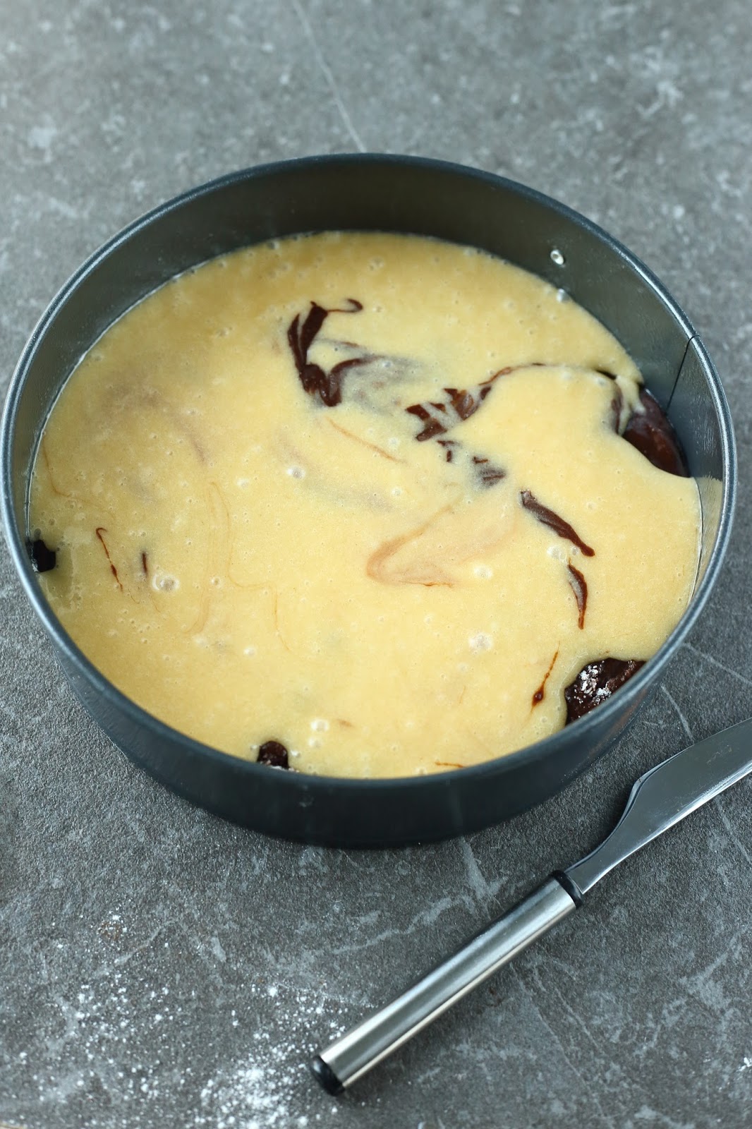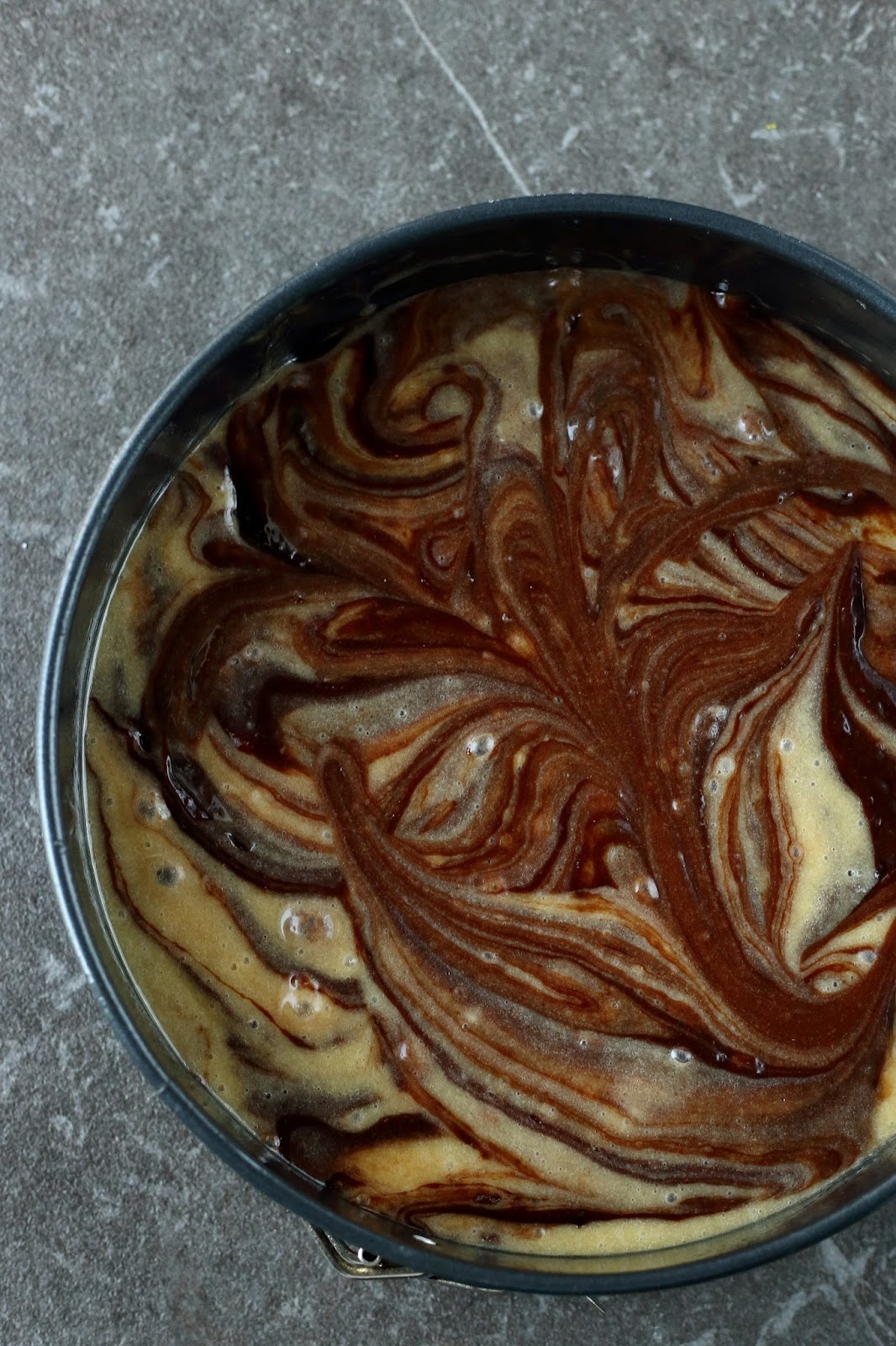 Kaavi sitten vielä loput tummasta taikinasta päälle. Marmoroi vetämällä taikinoita veitsellä tai lusikan varrella sekaisin. Huomaa, että mitä enemmän sekoitat, sitä vähemmän marmorointi näkyy.