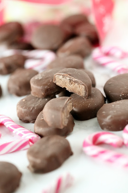 Makeisten sisällä on tosi helppotekoinen ja maultaan ihanan piparminttuinen täyte. Sellainen pehmoinen, hieman jauhomainen, joistakin minttumakeisista tuttu sisältö (en saa päähäni sen tarkempaa nimeä). Maku noin ylipäätään muistutti melkoisesti after eightejä, nams! Täyte tosin ei ole näissä niin pehmeä ja tahmea, mutta se maku, se maku.. Muistan nähneeni tällaisten vastaavanlaisen täytteen joskus kaupassa plaratessani jotain leivontakirjaa (mutta enhän mä nyt enää sitä kirjan nimeä muista). Mieleeni jäi vain se, että joukossa oli suklaata ja tomusokeria ja niistä saatiin helppo ja nopea täytemassa karkeille. On tosi toimiva idea, ja piparminttuöljyllä maustettuna myös herrrrrkkua!