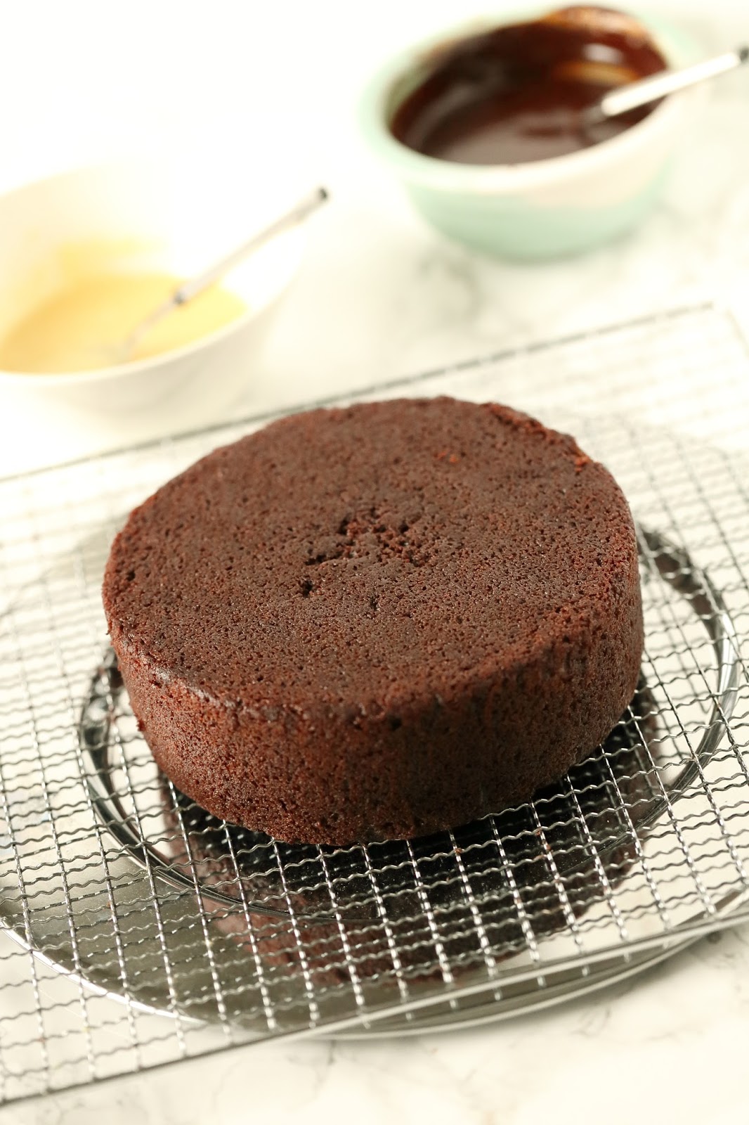 Tee pohjat. HUOM! Ohjeella tulee kaksi pohjaa, mutta kuorrutus on vain yhden kakun päälle!Sulata voi ja suklaa mikrossa varovasti välillä sekoittaen. Sekoita joukkoon öljy, vesi, piimä, sokerit sekä munat yksitellen. Sekoita kuivat aineet keskenään ja lisää joukkoon. Sekoita nopeasti tasaiseksi taikinaksi. Kaada taikina kahteen voideltuun n. 16 cm irtopohjavuokaan ja paista 170 °C noin 55 minuuttia tai/ja kunnes tikkuun ei jää kokeiltaessa taikinaa. Anna jäähtyä.