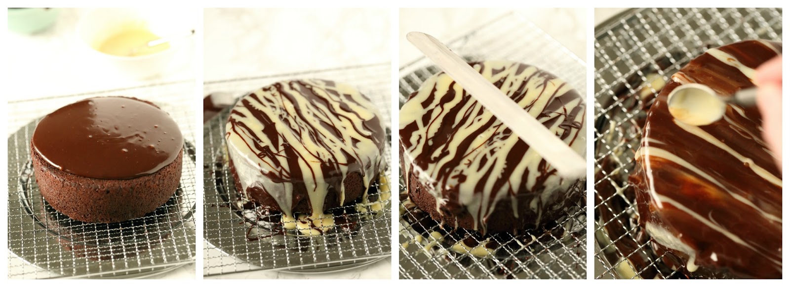 * Jos haluat kuorrutukseen selkeämmät valkoiset raidat (kuten toisessa vaihekuvassa vasemmalta), levitä ensin kaikki tumma suklaaseos kakun päälle reunoja myöten. Liruttele sen jälkeen kakun pintaan valkosuklaa ohuina noroina (saman suuntaisesti). Älä enää tämän jälkeen koske pintaan, vaan anna jähmettyä.