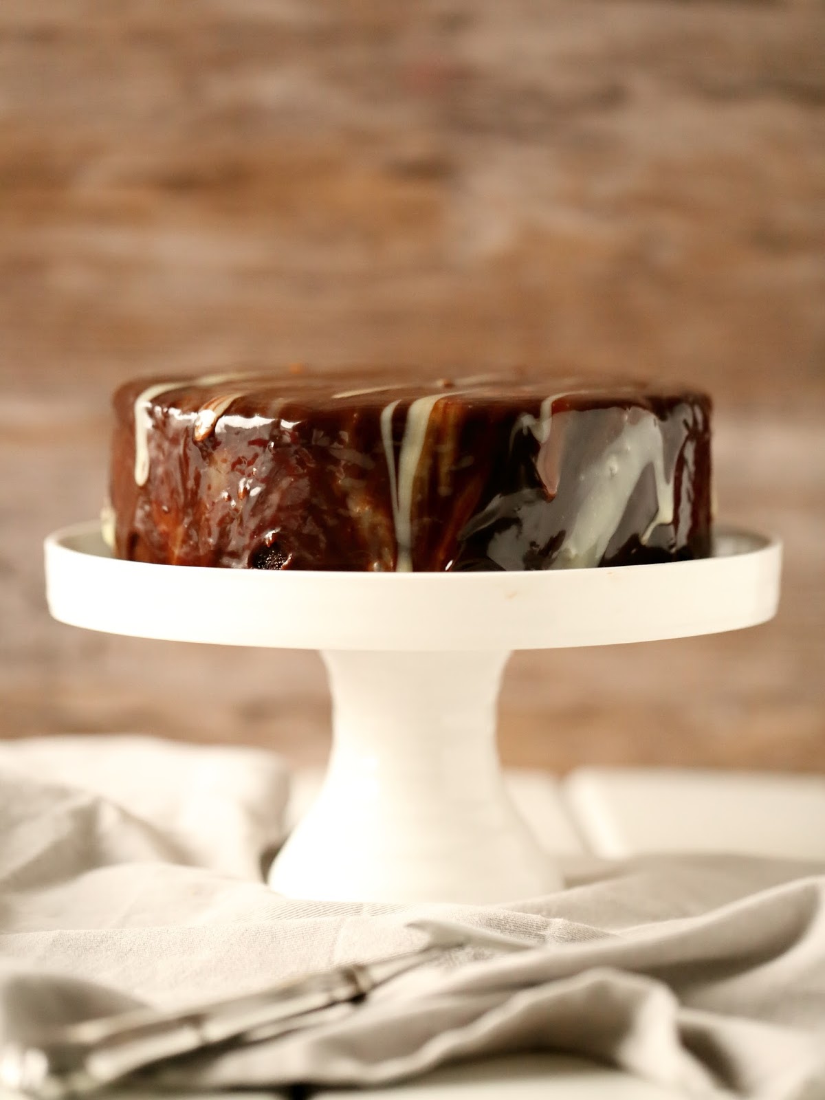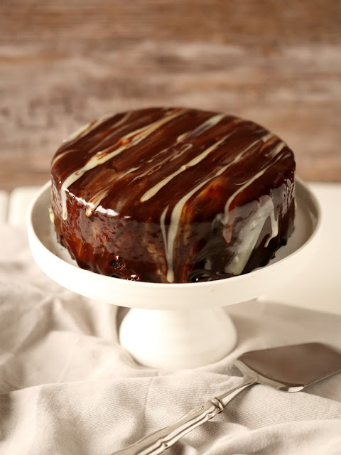 Tällä kertaa tein tuon monia ihastuttaneen Mielettömän mehevän suklaakakkupohjan aavistuksen kevennettyä. Taikinassa oli hieman vähempi rasvaa ja vastaavasti enemmän hapanmaitotuotetta. Vähän samalla tavalla, kuin joulukuisessa nakukakku-tyyppisessä suklaakakussakin, jossa testailin taikinan keventämistä ensimmäistä kertaa. Mutta toimihan se taikina tälläkin kertaa. Eli jos tykkää mielettömän mehevästä suklaakakusta, mutta haluaa keventää sitä, kannattaa ihmeessä kokeilla tätä pohjan ohjetta!Muokkasin kuorrutetta tätä kakkua varten hieman pehmoisemmaksi, ja nyt koostumus olikin erittäin hyvä. Pehmeä, hyvin leikattavissa, mutta silti tarpeeksi jämäkkä. Kuvissa kuorrute on täysin tuore ja kiiltävä, mutta se mattaantui hieman jääkaapissa. Mutta se maku, slurps! Herrrrrkkua!