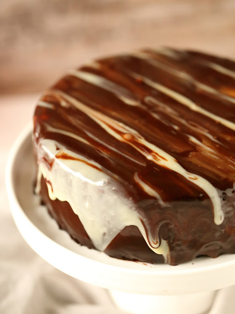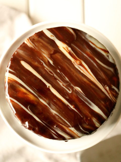 Levitä tumma suklaa kakun päälle ja levitä kevyesti niin, että sitä valuu kakun reunoilta alas (alla olevassa kuvassa tumma suklaa on vain kakun päällä, mutta levittelin sitä vielä tuon jälkeen valumaan reunoilta alas). Liruttele päälle melkein kaikki valkosuklaa ohuina raitoina ja tasoita lastalla valkosuklaaraitojen suuntaan kevyesti vetäen vain sen verran, että valkosuklaakin valuu reunoilta hieman alas. Älä sekoita liikaa, jotta valkosuklaa ei sekoitu täysin tumman suklaan joukkoon. Liruttele päälle vielä ohuina noroina loppu valkosuklaa. Anna jähmettyä.