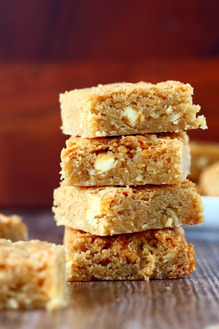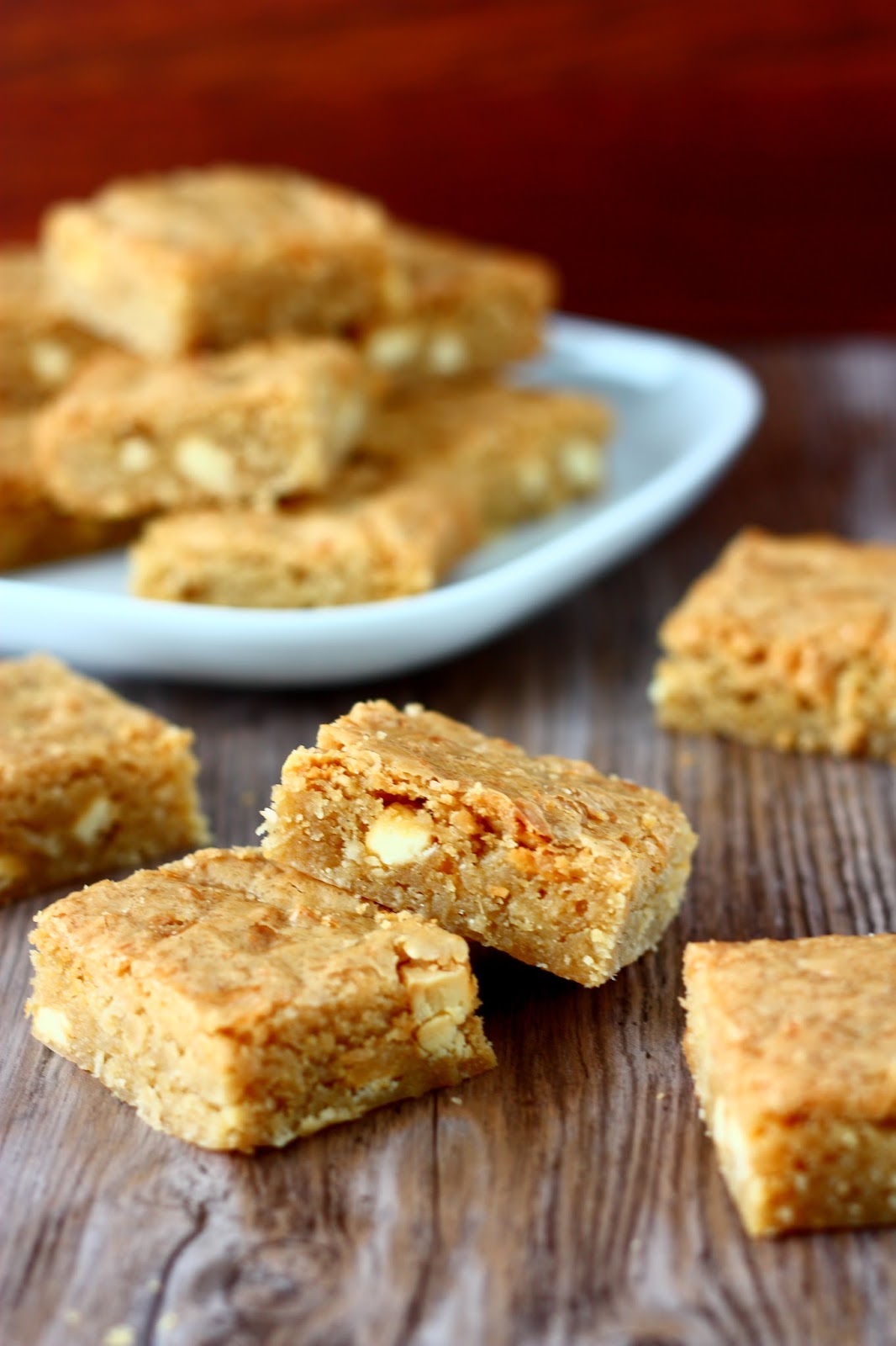 Löysin ihanan kuulloisen blondiesohjeen netistä ja muistin, etten ollutkaan aikoihin tehnyt mitään blondiesihanuuksia, joten eipä muuta kuin keittiöön puuhailemaan. Blondies on kostean brownies-leivonnaisen vaalea sukulainen, joka isoveljensä tavoin on kostea ja mehevä.