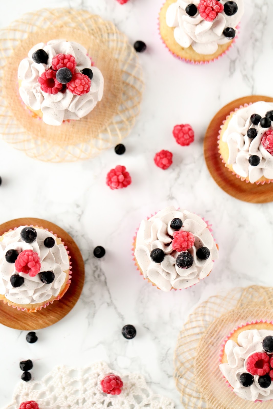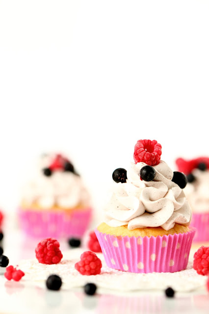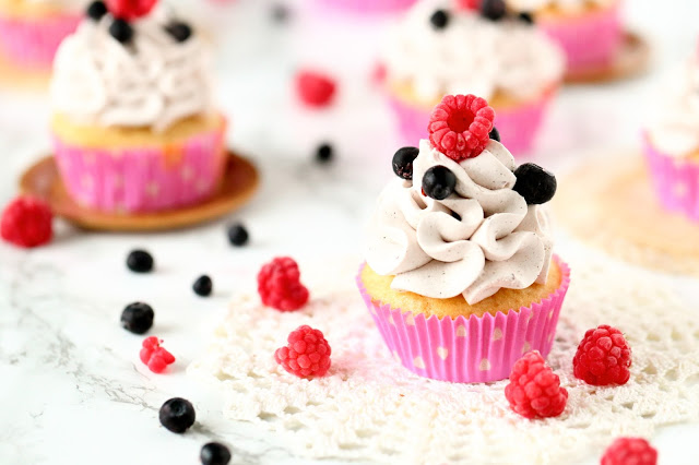 Kun muffinssit ovat jäähtyneet, tee kuorrutus. Vatkaa Flora Kuohu vaahdoksi. Vatkaa joukkoon notkistettu tuorejuusto. Mausta vaniljajauheella ja tomusokerilla. Lusikoi vaahto pursotuspussiin ja pursottele muffinssien päälle. Koristele vielä vadelmilla ja mustikoilla.