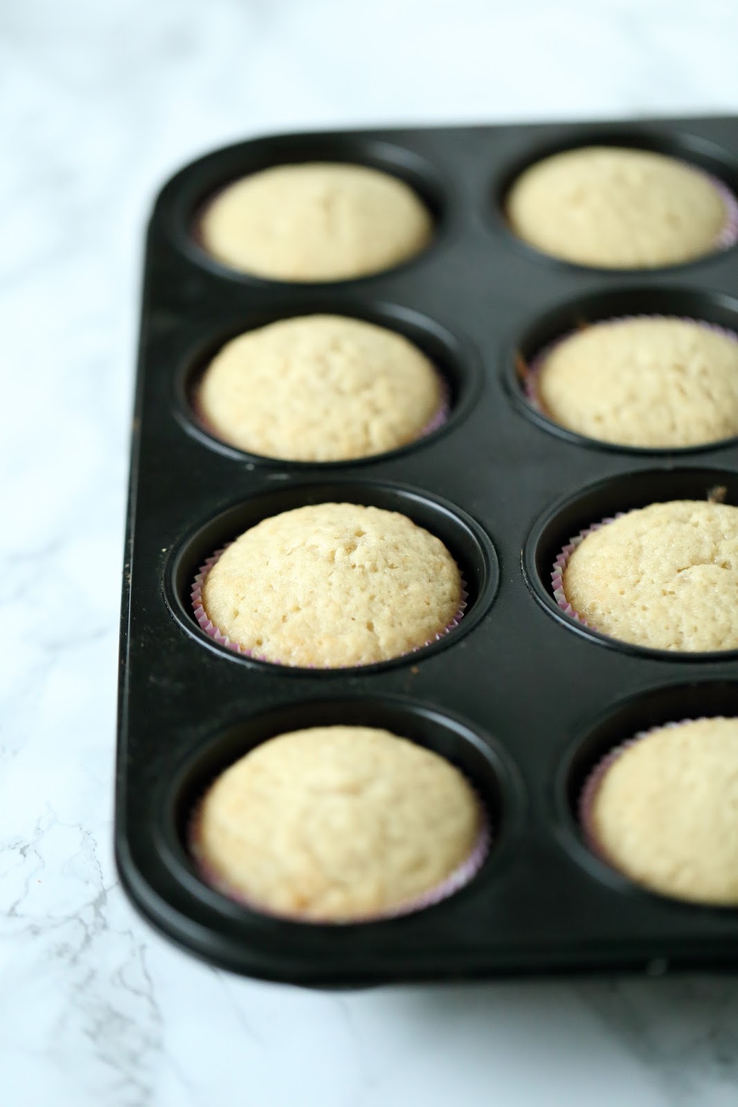Mittaa taikinan kaikki aineet kulhoon ohjeen mukaisessa järjestyksessä ja sekoita nopeasti sekaisin, älä vatkaa. Lusikoi taikina muffinssipellillä oleviin muffinssivuokiin. Jätä vuokiin reilu sentti tilaa kohota. Paista 200 asteessa, kunnes kypsiä eli n. 15 minuuttia. Anna jäähtyä hetki pellillä ja nostaa sen jälkeen pois pelliltä ja jäähdytä kokonaan hyvin peitettynä.