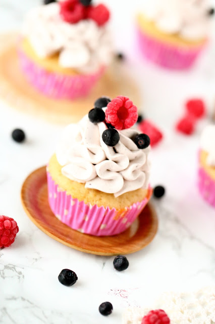 Nämä muffinssit ovat älyttömän helppoja ja nopeita tehdä. Pohjat syntyy vain sekoittamalla aineet yhteen ja helppo kuorrutus saa makua valmiiksi maustetusta tuorejuustosta. Muutama marja päälle, niin herkku on valmis.