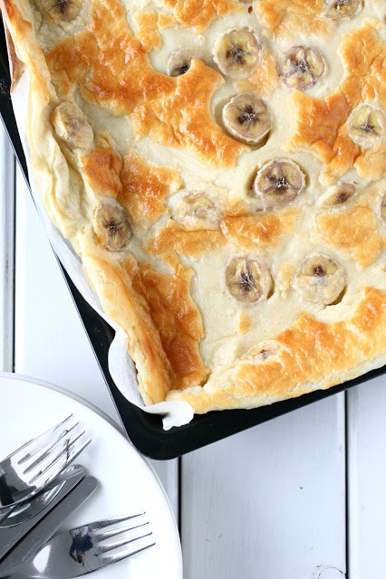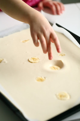 Pilko banaanit paloiksi. Kaada turvonnut taikina leivinpaperoidulle n. 30 x 40 cm uunipellille. Heittele päälle banaaninpalat.