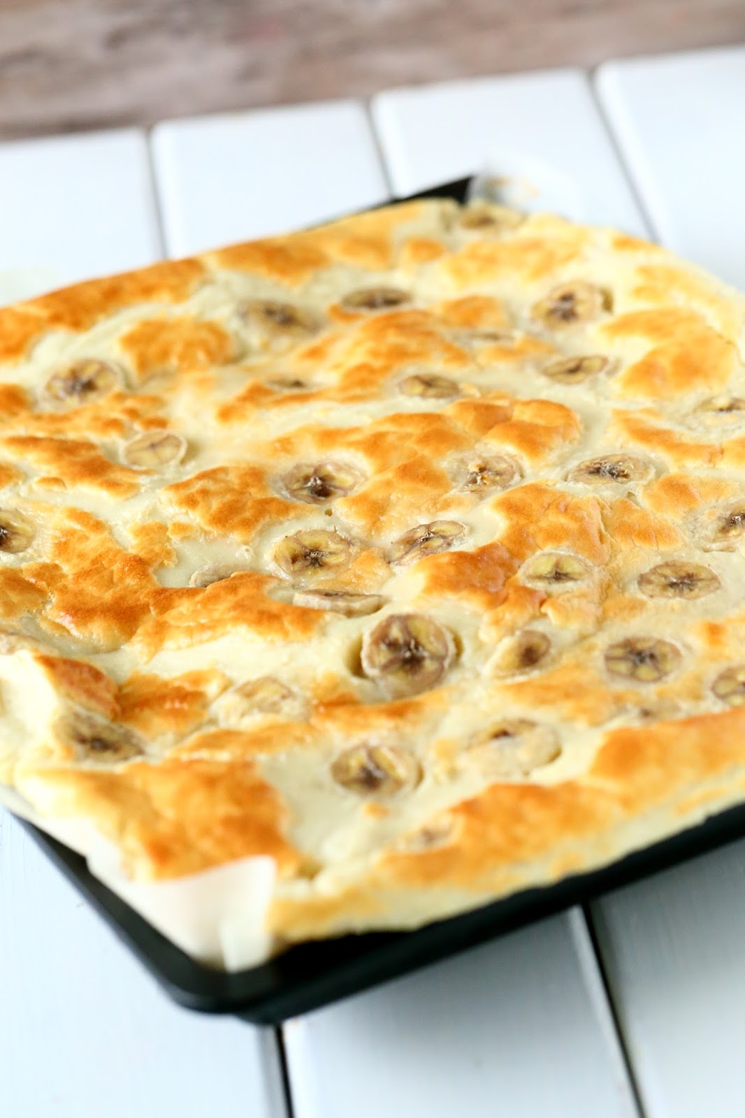 Pilko banaanit paloiksi. Kaada turvonnut taikina leivinpaperoidulle n. 30 x 40 cm uunipellille. Heittele päälle banaaninpalat.