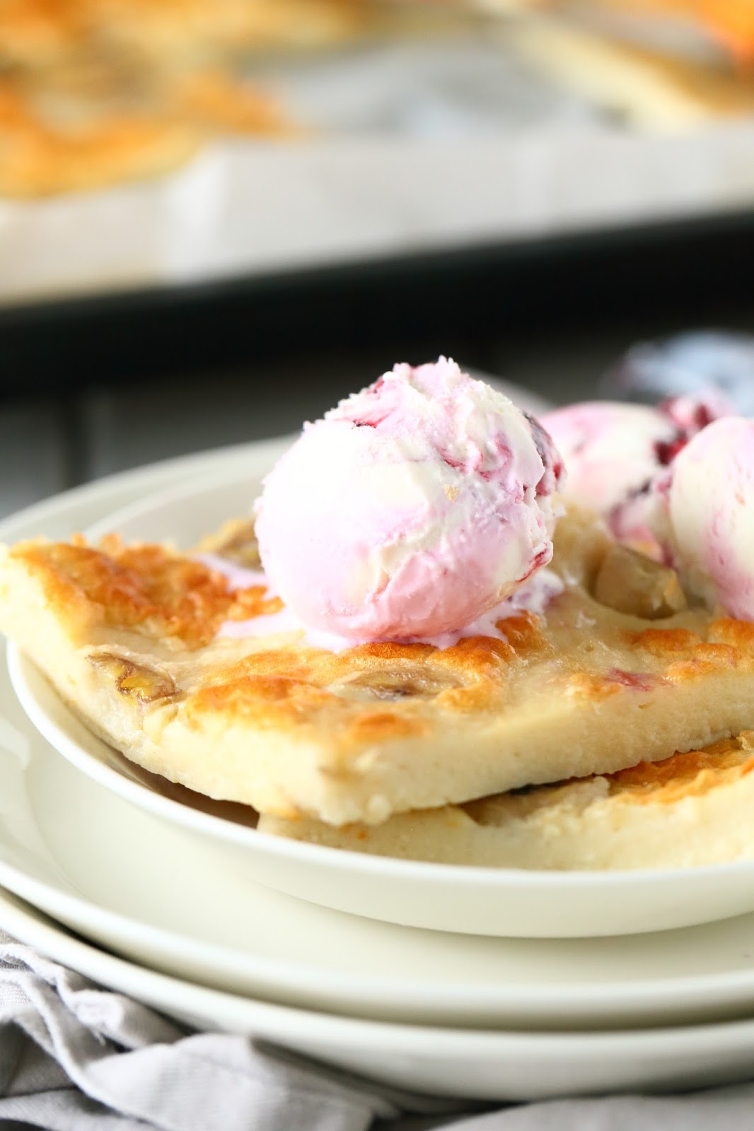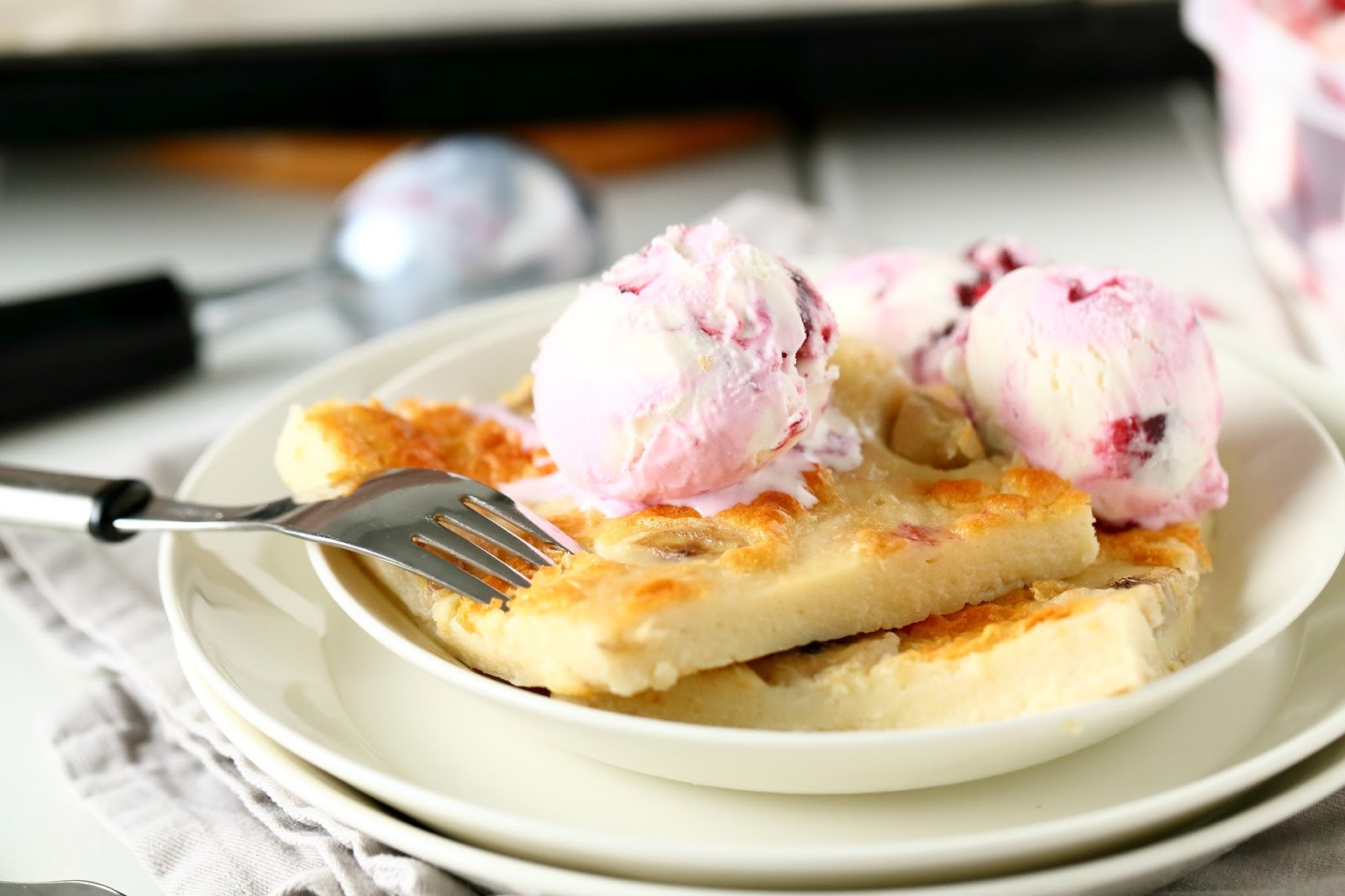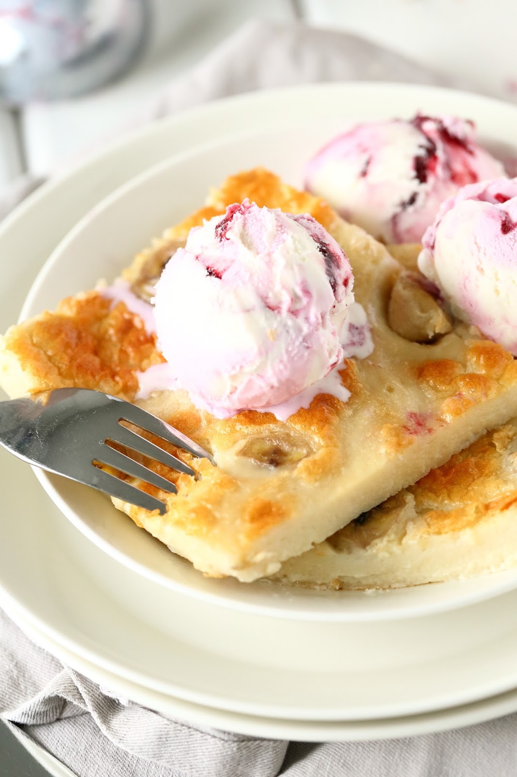Pehmeä, miedon kookoksinen, paksu, maukas, banaanin paloja sisältävä pannukakku ja vadelmajäätelöä, ihanaa! Se on sellaista herkkua, että kun ensimmäisen kerran sitä maistoin anoppilassa, pyysin samantein ohjetta, jotta pääsisin tekemään samanlaista herkkupannaria myös kotona.