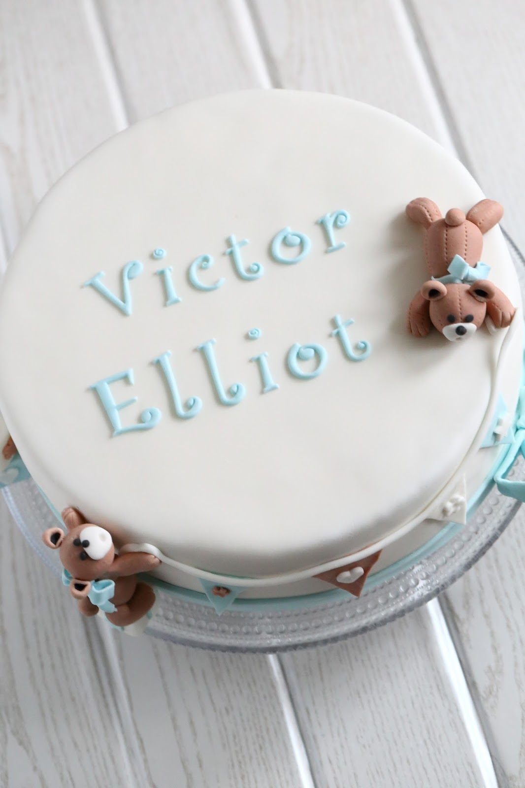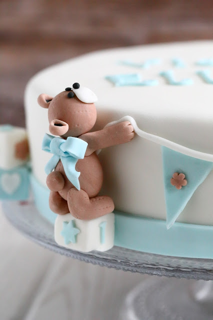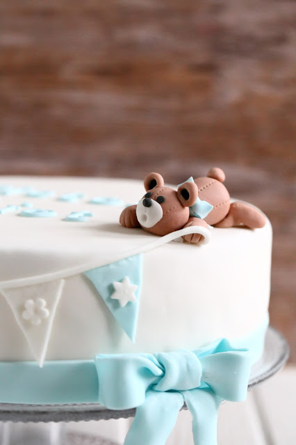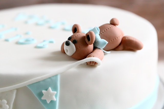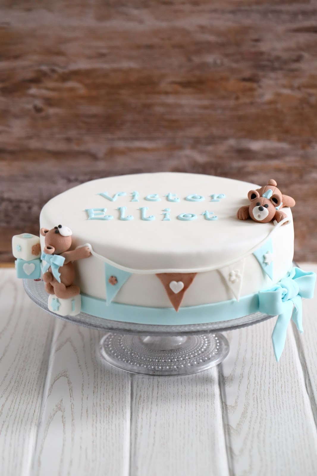 Keväällä vietettiin pienen pojan ensimmäisiä juhlia ja sain pyynnön tehdä sinne kakun. Toiveena kakussa oli hempeä värimaailma, jossa olisi valkoista, sinistä ja ruskeaa, ja kakun toivottiin olevan kokonaisuudessaan hillitty. Pojan äiti ihastui Marsispossun upeisiin luomuksiin ja lähetti linkin kakkuun, jossa oli nalleja ja viiri. Sain muutoin kakun suhteen vapaat kädet, mutta päätin kokeilla vähän samantyyppistä kakkua. Tällainen siitä sitten tuli 🙂