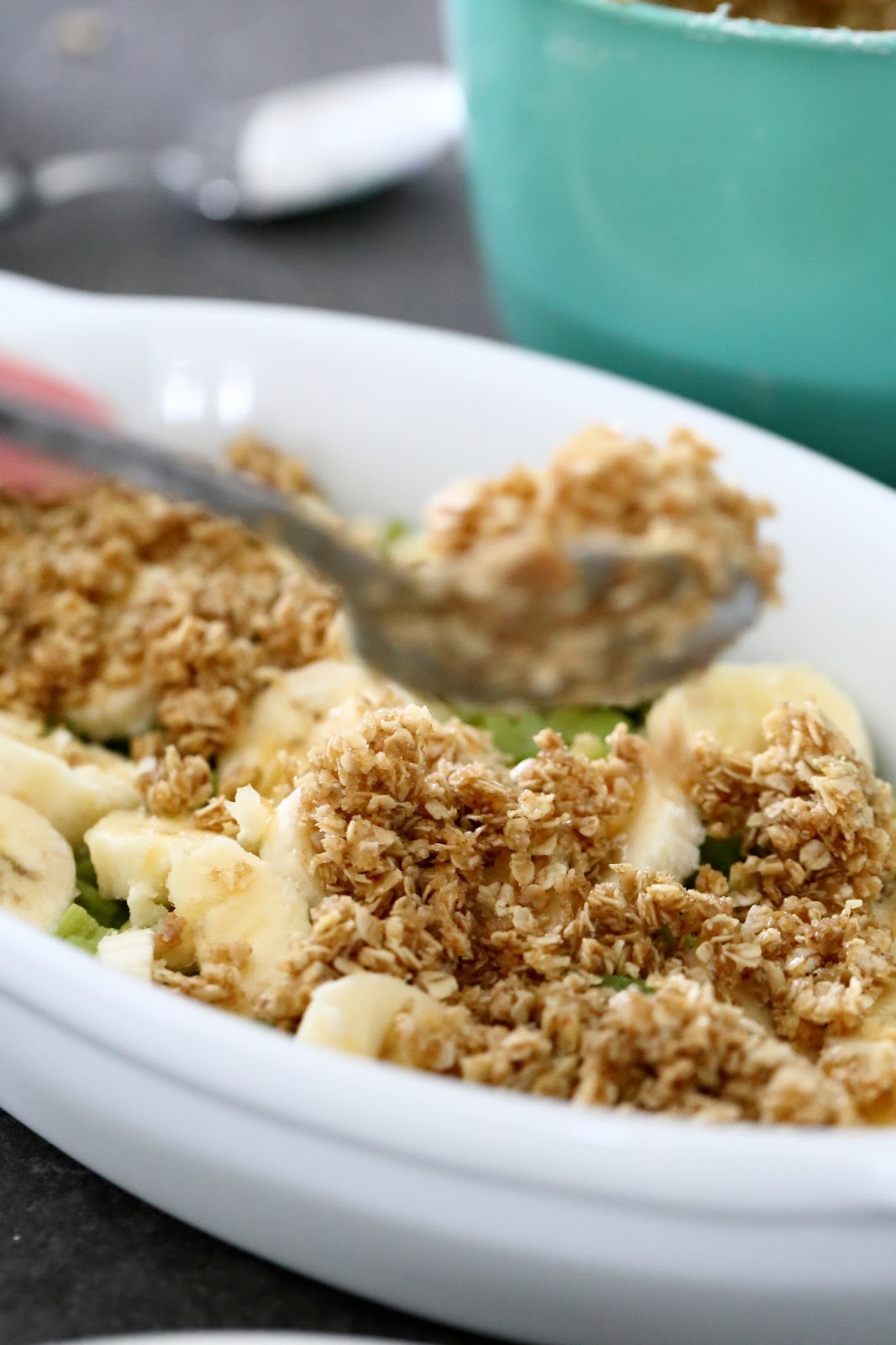Sekoita loput aineet keskenään. Lusikoi kauramuruseos banaanien ja raparperien päälle ja tasoita kevyesti