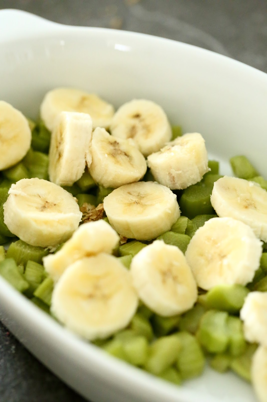 Jos käytät pakastettuja raparperia, valuta ensin vesi pois hieman sulaneista raparperin paloista. Viipaloi banaanit viipaleiksi. Kaada vuoan pohjalle raparperin palat ja banaanin siivut.