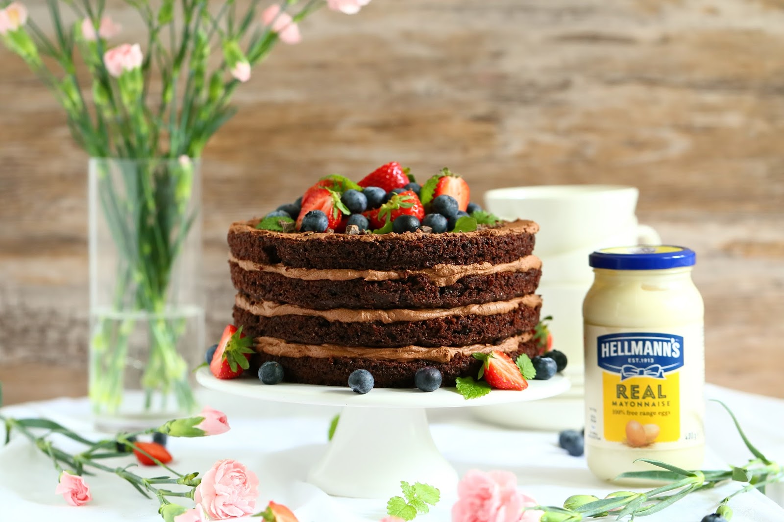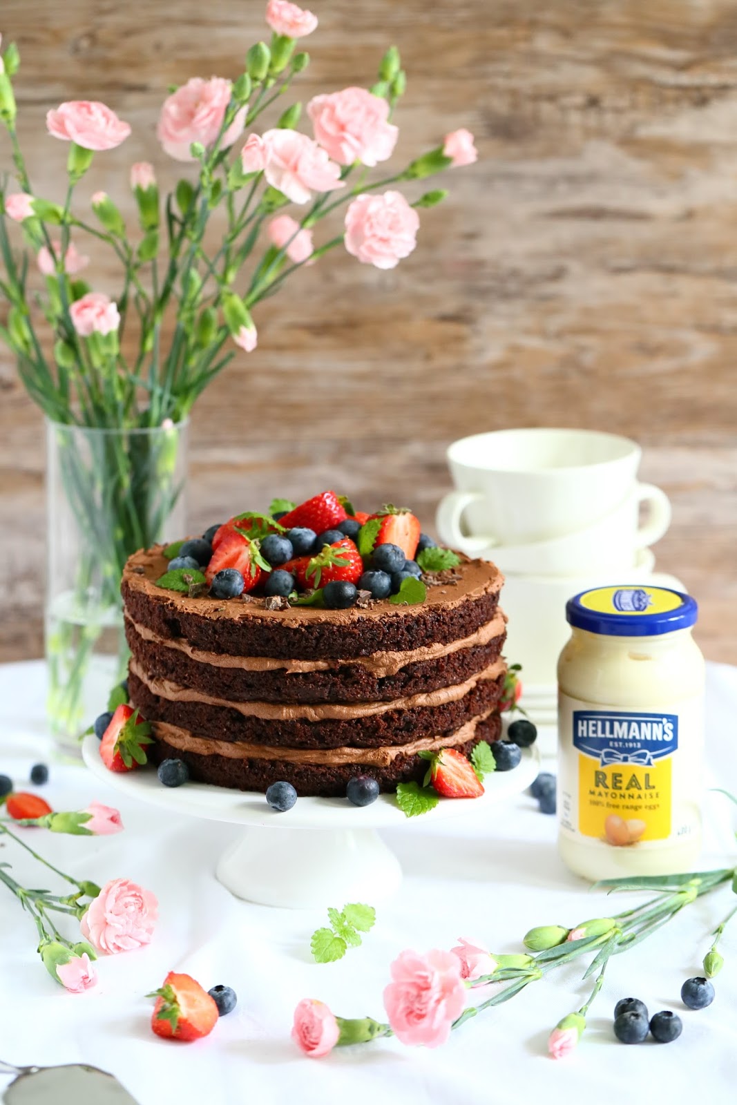 Miltä kuulostaisi, jos tämän kesän valmistujaisten ja muiden juhlien juhlapöydän kakku olisi maukas ja kostean mehevä suklaakakku, rentona nakukakkuna? Ihanalta? Herkulliselta? Juuri siltä, mitä juhlien kakun pitääkin olla? Niin minustakin! En voi muuta olla kuin iloinen, että pääsin mukaan kaupalliseen yhteistyöhön Hellmann’sin kanssa kehittelemään jotain herkullista Real majoneesista. Ilman yhteistyötä olisi nimittäin jäänyt syntymättä tämä aivan älyttömän herkullinen ja mehevä suklaakakku, jonka sisältä löytyi pehmeää suklaamoussea. Maistaessani ensimmäisen palan, en voinut enää pitää haarukkaa erossa pehmeästä kakkupalasta, vaan kauhaisin suuhuni nopeasti toisen palan. Aivan ihanaa, törkeän hyvää, olivat ensimmäisen mieleeni nousevat sanat.