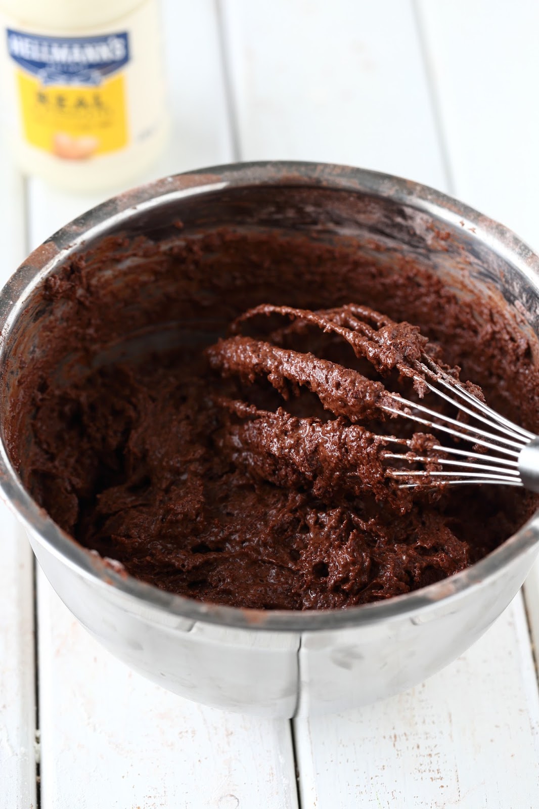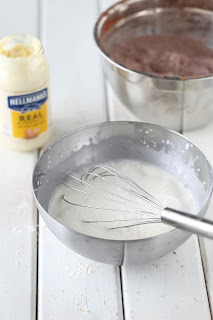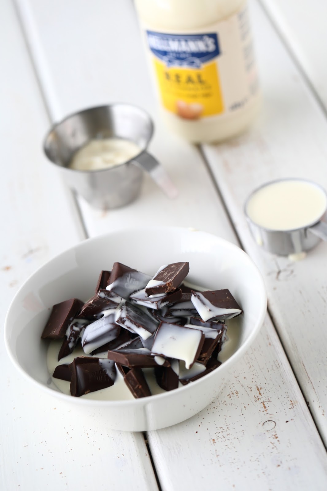 Kuumenna suklaata mikrossa välillä sekoitellen, kunnes kaikki suklaa on sulanut. Lisää joukkoon loput eli 1 dl vispikermasta sekä 0.5 dl Hellmann’sin majoneesia. Sekoita, kunnes kaikki aineet ovat hyvin sekoittuneet keskenään.