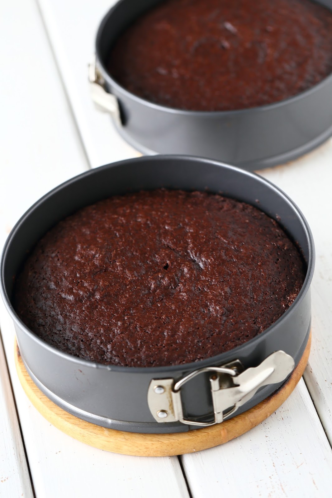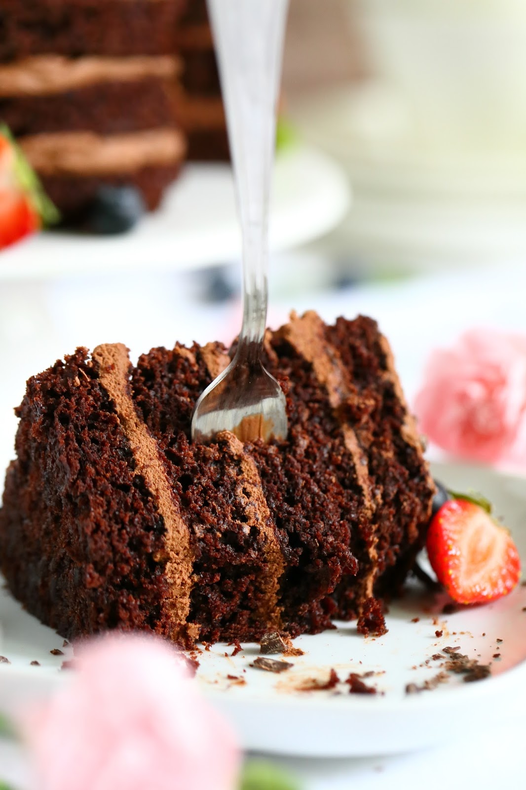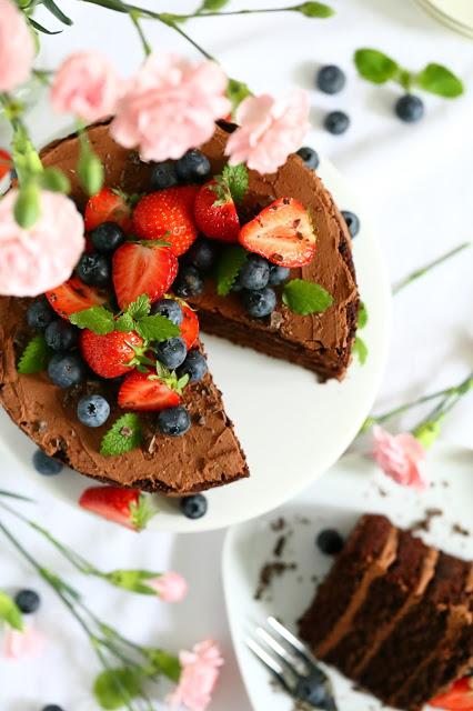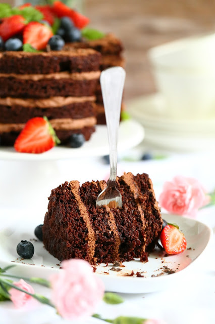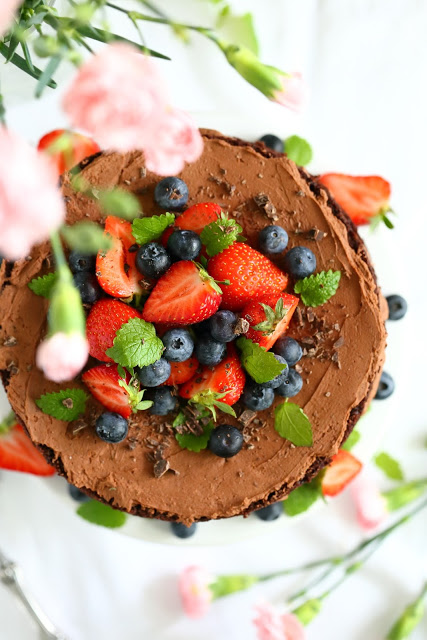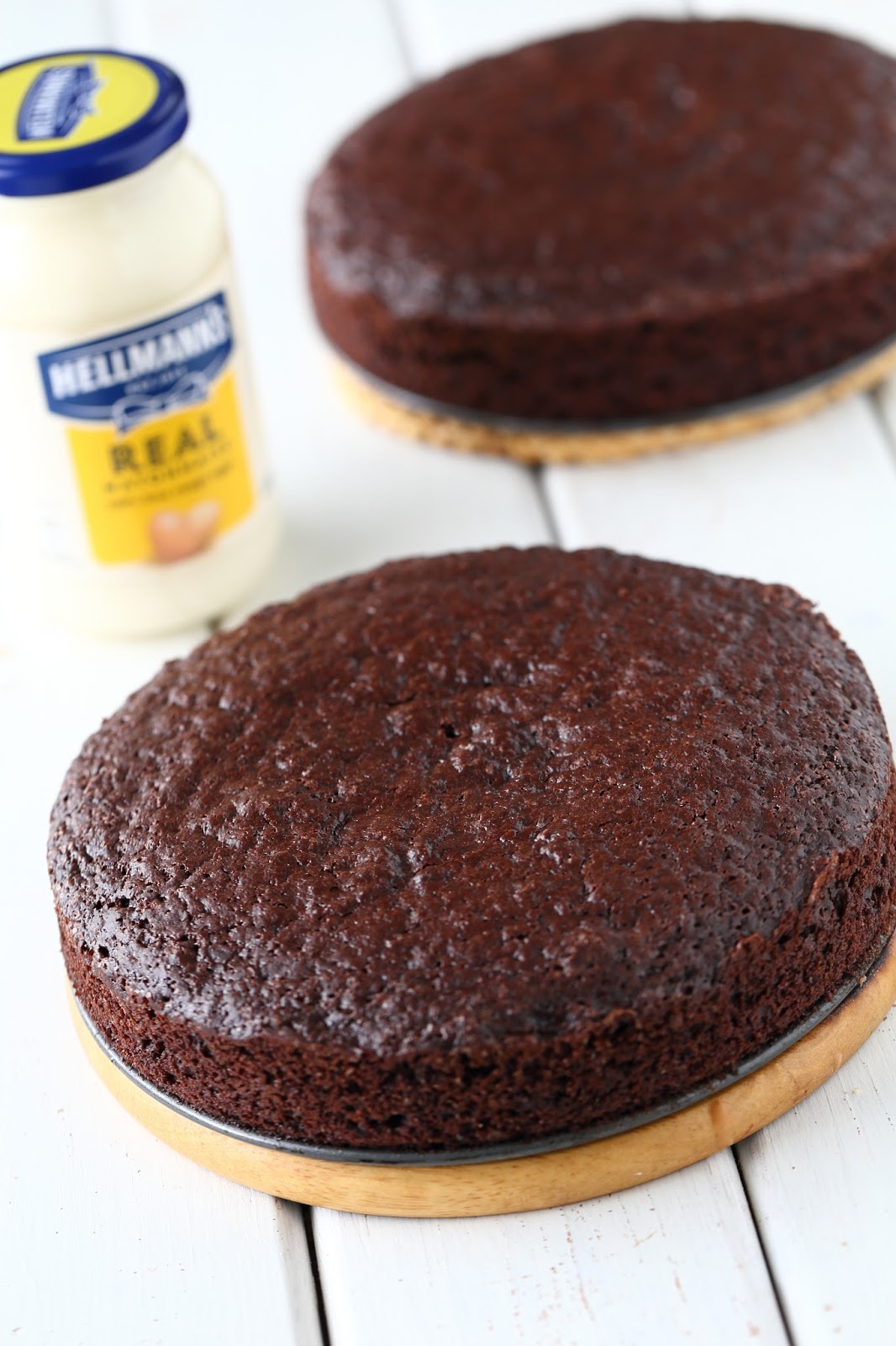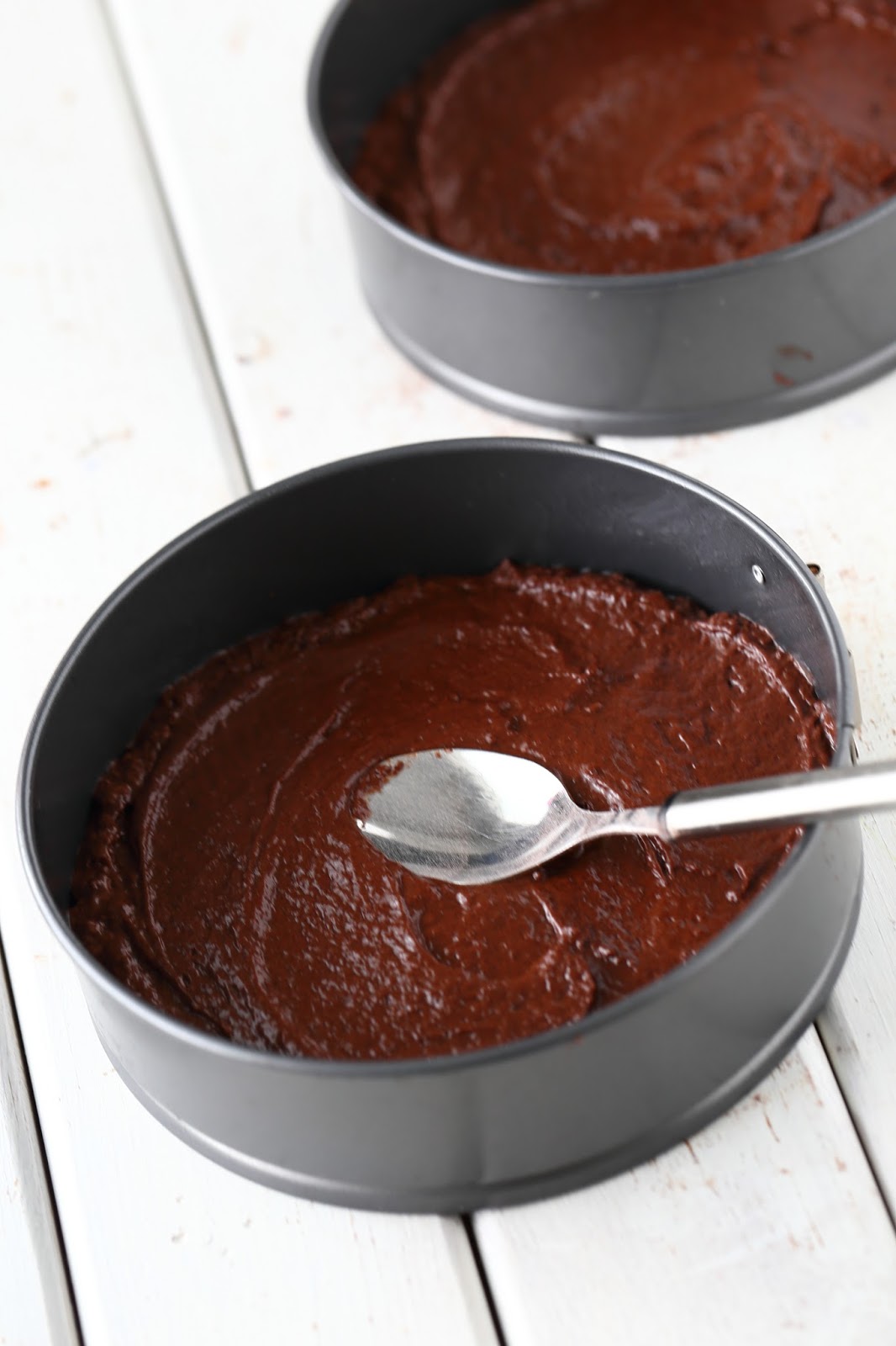 Kakku on muuten myös todella helppotekoinen, sillä kakkupohjan aineet vain sekoitetaan nopeasti yhdessä kulhossa sekaisin ennen kuin taikina kaadetaan vuokiin paistumaan. Pehmeä ja kuohkea suklaamoussekin valmistuu helposti sekoittamalla sulatetun suklaan + kerman joukkoon hieman majoneesia. Hetki jääkaapissa, ja täytteen voi hurauttaa vatkaimella kuohkeaksi ja pehmeäksi. Tämän jälkeen kakku on valmis täytettäväksi ja pian myös nautittavaksi. Helppoa, eikö! 🙂