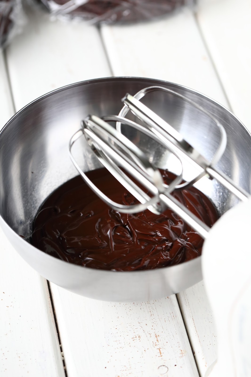 Laita suklaaseos muutamaksi hetkeksi jääkaappiin jäähtymään. Vatkaa jäähtynyttä, edelleen pehmeää suklaaseosta vatkaimella, kunnes se vaalenee ja kuohkeutuu.