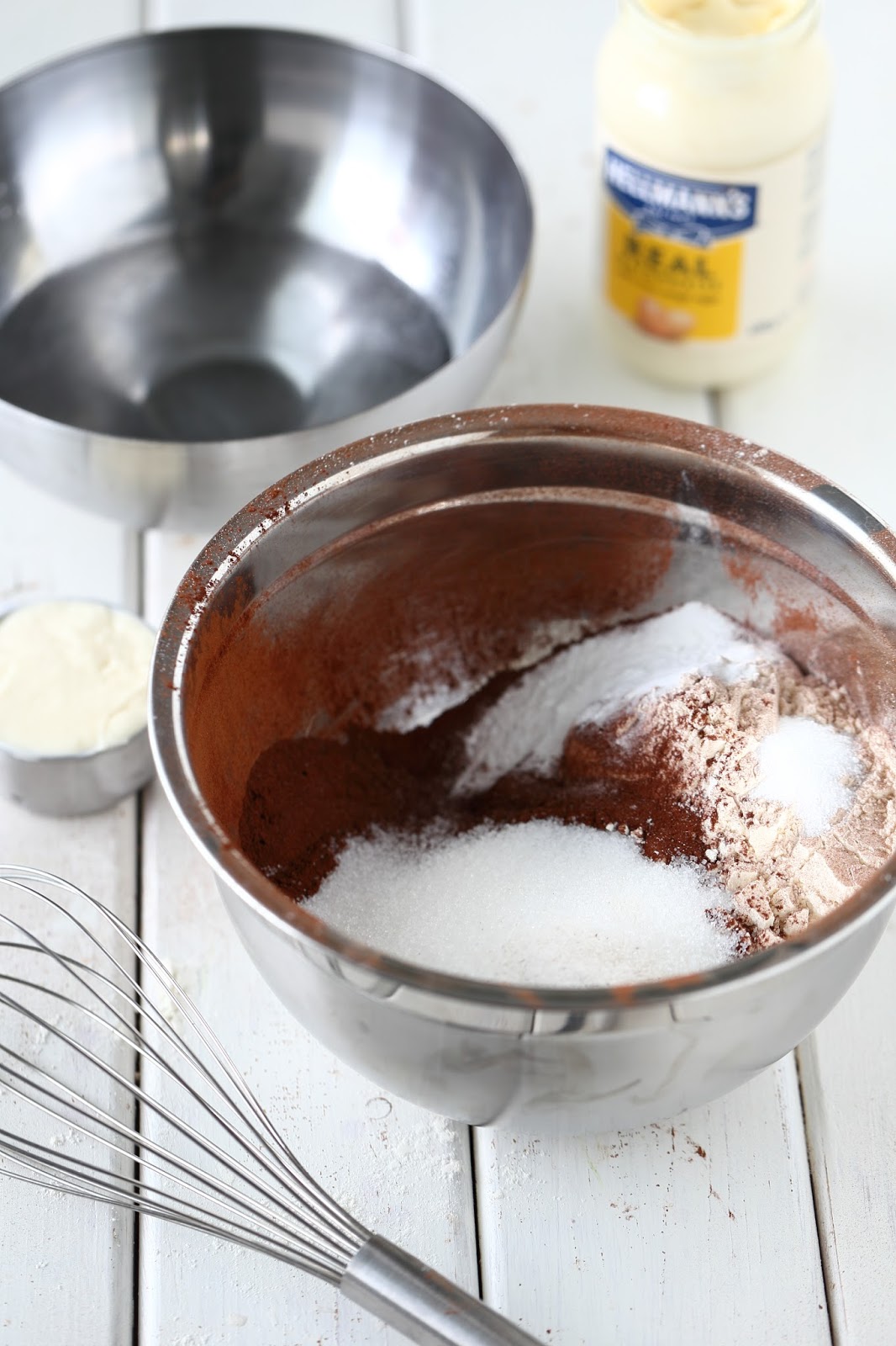 Tee ensin pohja. Sekoita kuivat aineet keskenään yhteen. Vatkaa Hellmann’sin majoneesi ja vesi pallovatkaimella sekaisin niin, että seos hieman vaahtoa.