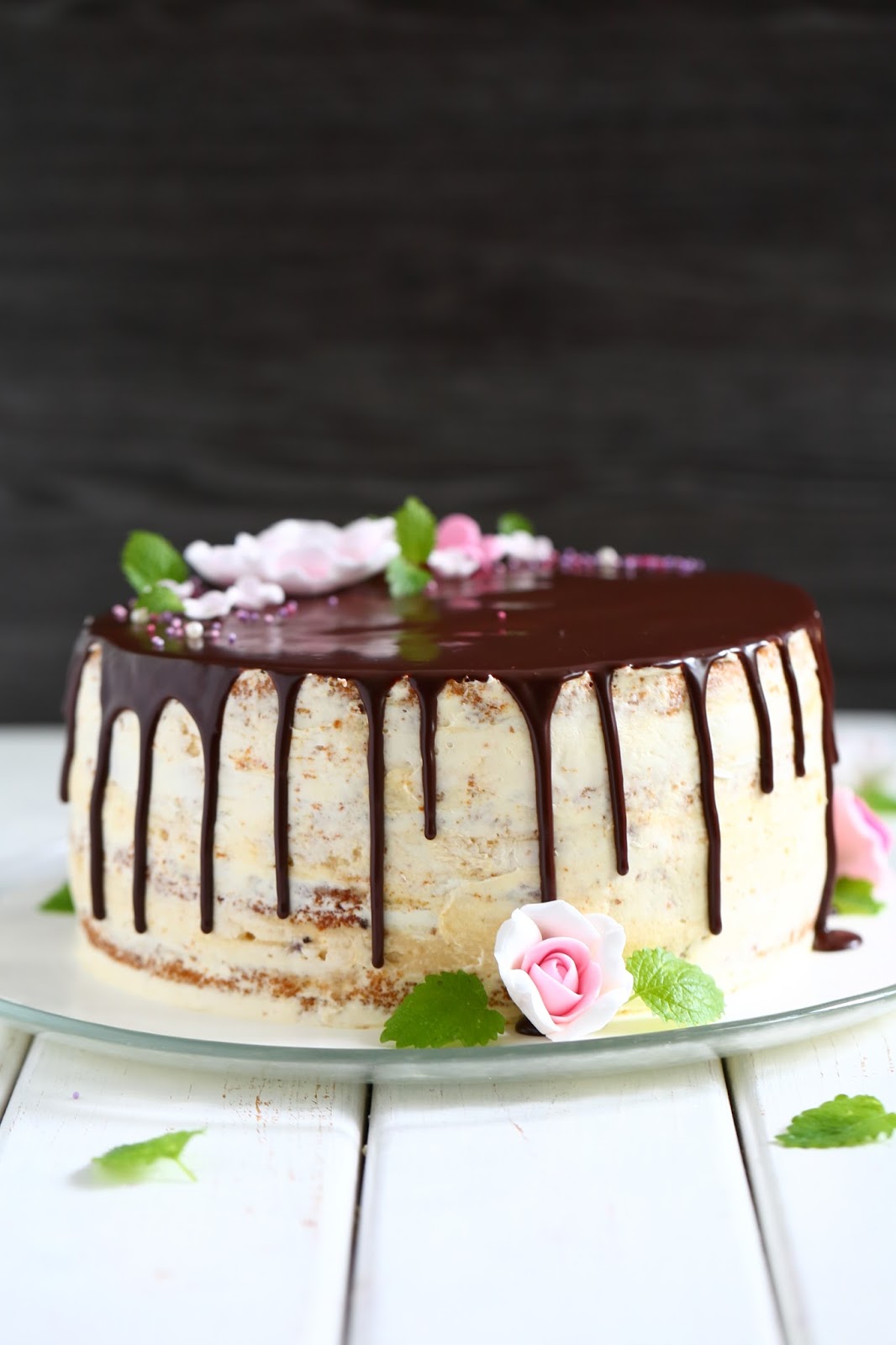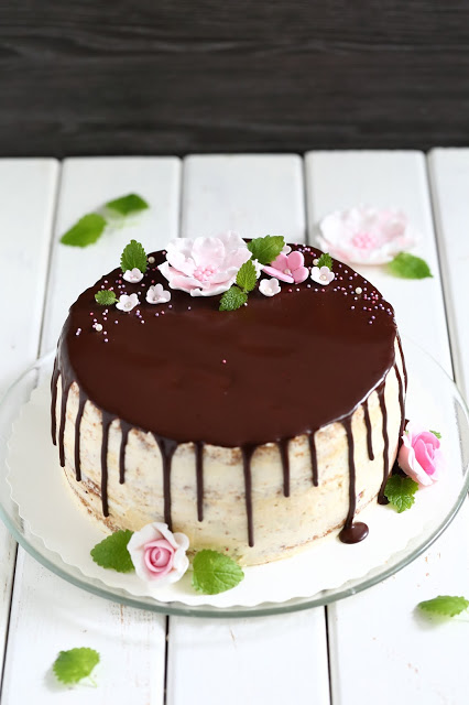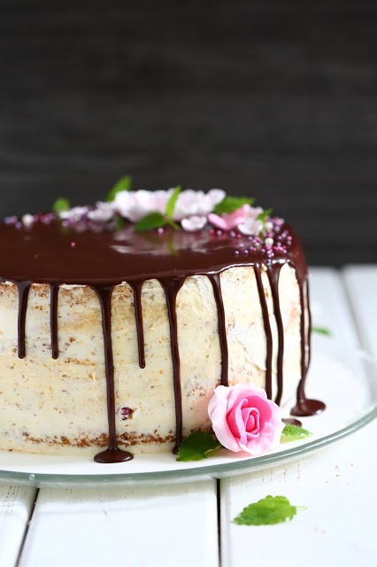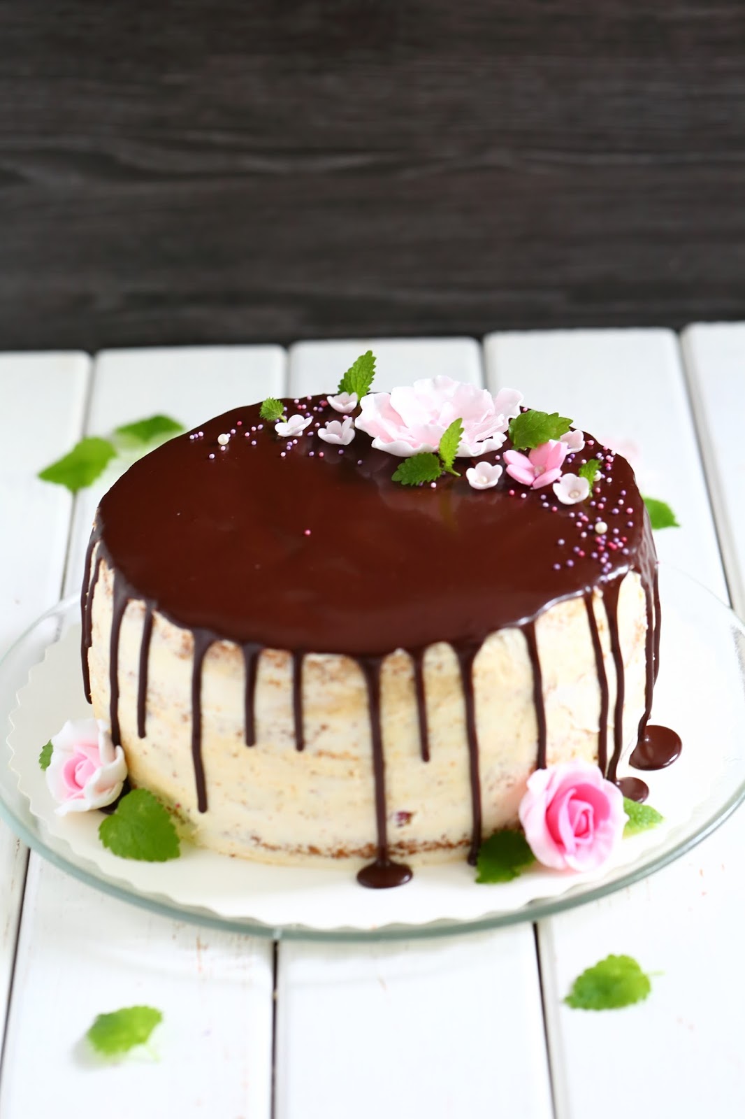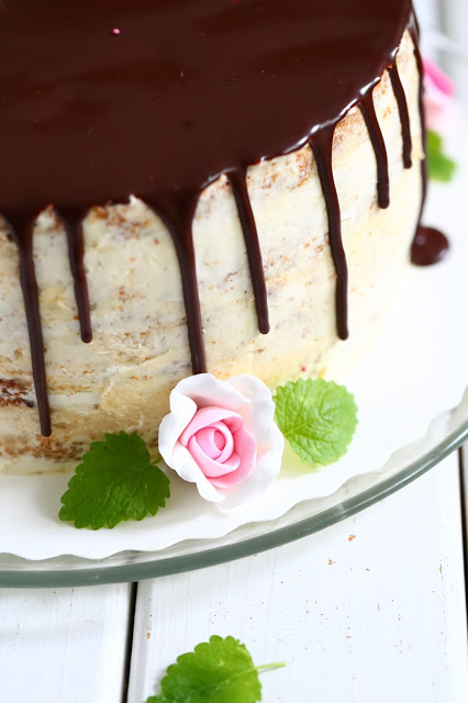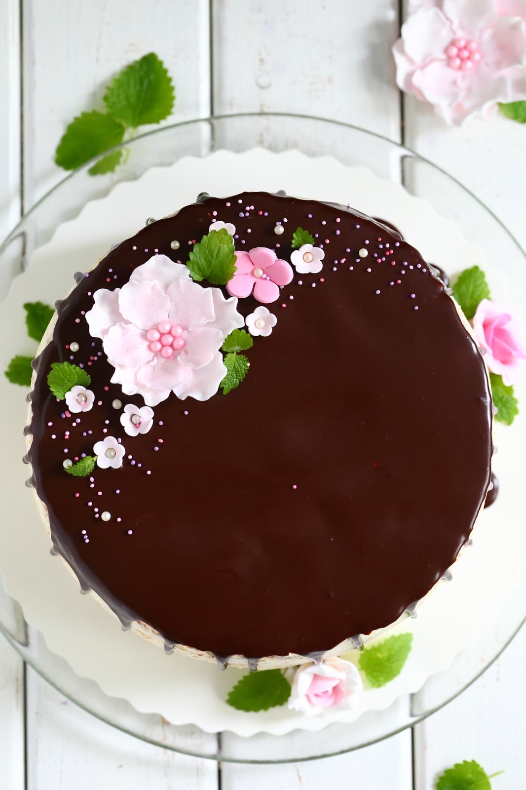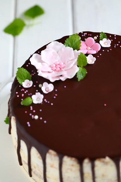Nakukakut ovat ihania kakkuja, sekä tehdä että rennon ulkonäkönsä puolesta. Päälle vielä kiiltävää suklaaganachea rennoin ottein, niin kakku oli jo miltei valmis. Koristeeksi päälle laitoin mm. tytön itsetekemiä pikkukukkia ja sitruunamoussetäytteisen 70-vuotiskakun koristelusta ylijääneen isomman kukan.