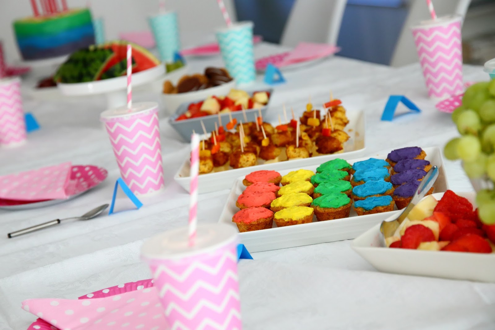 En malttanut tietenkään olla muokkaamatta ohjetta. Munattomat ohjeet ovat olleet testilistallani, joten testailin myös näissä, miten taikina toimii munattomana. Jätin siis munat pois, samalla vähensin sokeria sekä laitoin öljyn sijasta osaksi piimää. Ensimmäinen erä nousi hyvin, mutta koloista ylitullut osa levisi pellille niin, että lopputulos muistutti leveälakkista sientä! Mutta se maku, oih ja voih, niin hyvä. Kosteaa ja mehevää, höttöistä, miedosti kanelista, ihanaa herkkua! Muokkailin ohjetta hieman lisää ja muffinssit nousivat nätimmin. Tosin tälläkin kertaa leviämistä oli havaittavissa, mutta sen sai peitettyä kuorrutteella. Jos haluaa välttää tuon leviämisen kokonaan, kannattaa taikinaan laittaa vielä aavistus lisää jauhoja. Ja täyttää muffinssivuoan kolot maltilla 🙂 Porkkanamuffinssien leipomisen jälkeen laskin, että niitä riittää meidän juhliin melkein 2 per juhlija ja mietin sen olevan riittävä määrä. Säästin kuitenkin varmuudeksi muutaman parhaimman muffinssin myös ensimmäisestä erästä, varmuuden vuoksi. Tästä huolimatta heräsin edellisenä yönä ennen juhlia paniikissa siihen pelkoon, että muffinssit loppuvat kesken. Sain hälvennettyä pelon ajattelemalla, että tarjolla on paljon paljon muutakin (alla olevassa kuvassa hieman osviittaa noista muista jutuista 🙂 ). Juhlien aikana huomasin muffinssikipon tyhjenevän hitaasti, mutta varmasti. Olin tyytyväinen, että olin säästänyt epäonnistuneesta erästä muutaman muffinssin, sillä nyt sain täytettyä tyhjenevää lautasta. Lopulta, tytön kavereiden lähdettyä naapurista tuli vielä yksi pienempi ”juhlija” herkuttelemaan mm. näillä muffinsseilla. Lopulta, illalla, lautasella oli 1 muffinssi jäljellä. Huh, ne riittivät sittenkin! Nämä pienet, värikkäät, mehevät porkkanamuffinssit tekivät siis hyvin kauppansa myös lapsille. Ensi kerralla kuitenkin otan varman päälle, ja varaan hieman reippaammin muffinsseja kullekin vieraalle 🙂