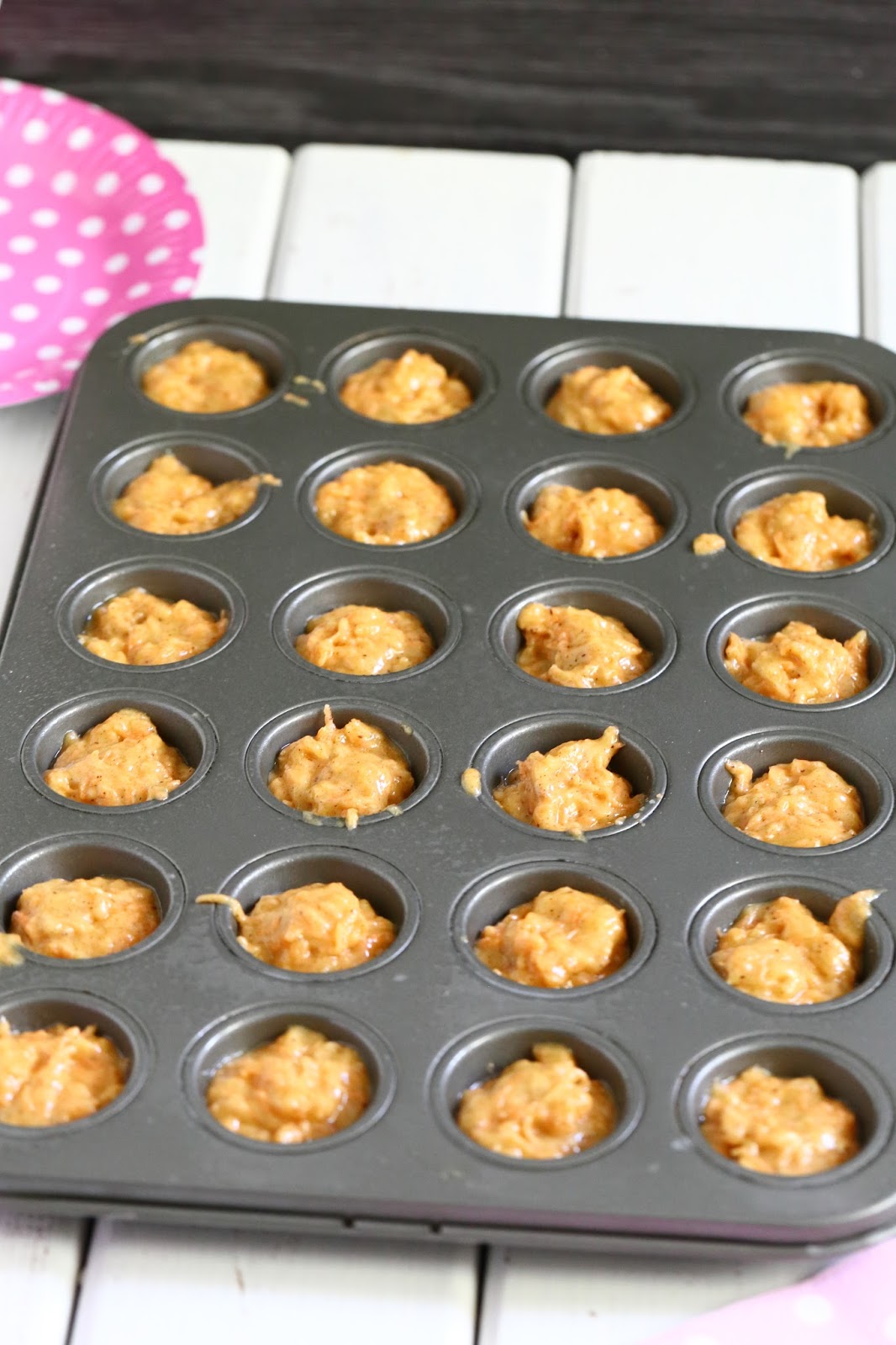 Lusikoi taikinaa voideltuihin pieniin muffinssipellin koloihin.