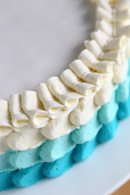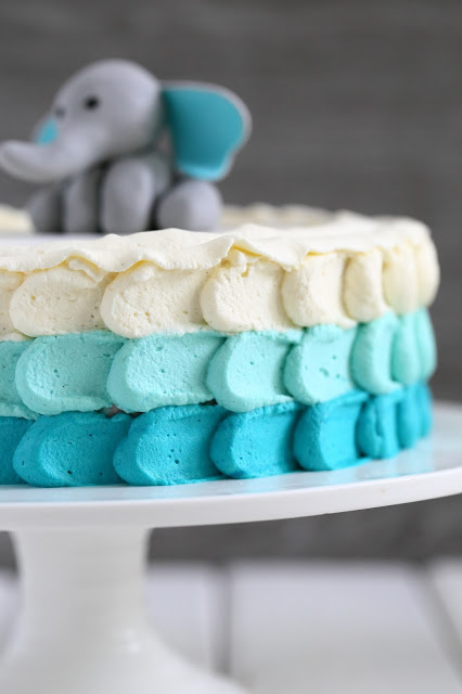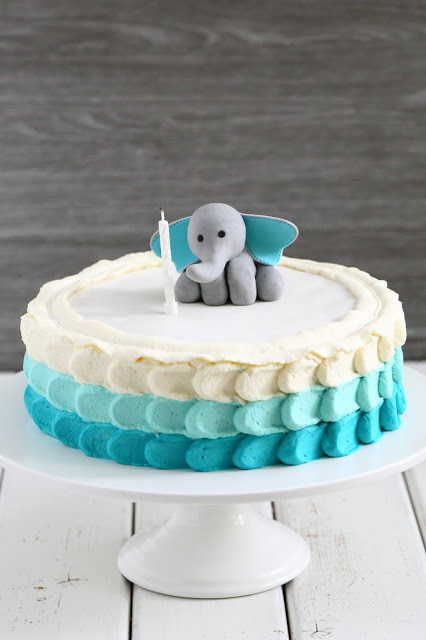 Itselläni tosin kerma ei ollut pursotukseen täydellistä. Ensinnäkin sitä oli liian vähän, enkä laittanut palluroita niin lähelle toisiaan, kuin olisin halunnut. Näin kerma riitti niukin naukin koko kakkuun. Sitten vielä tuo vähäinenkin kerma meni vatkausvaiheessa liian rakeiseksi. Käytin laktoositonta vispikermaa ja käsissäni tuo tuppaa vatkautumaan jok’ikinen kerta hitusen liikaa, vaikka kuinka varoisin. Lähikuvasta tuon rakeisuuden näkee erityisen hyvin. Siitä näkee myös tosin senkin, ettei kakun yläreuna ole aivan siisti. Tähän on hyvä syykin. Syy löytyy siitä, että pursottaminen on mulle ollut aina hieman hankalaa ( = liian vähän harjoittelua) ja testailin ensin samalla yläreunaan erilaista, laineilevaa pursotusta. Tuo (alla olevassa kuvassa näkyvä) pursotus oli kyllä tosi nätti, mutta olisi ehkä sopinut enemmänkin tytön kakkuun. Lisäksi kakku muistutti jo vähän liikaa sirkusta, kun laitoin päälle vielä elefanttikoristeen.. Lusikoin pursotuksen pois ja kokeilin vielä pari kertaa eri tyylejä. Pakostakin siitä kakku kärsii, kun jatkuvasti ronkitaan 😉 Totesin lopulta, että parree pysyä yksinkertaisessa, jotta nätti ombre-pursotettu reunaosakin pääsee oikeuksiinsa.