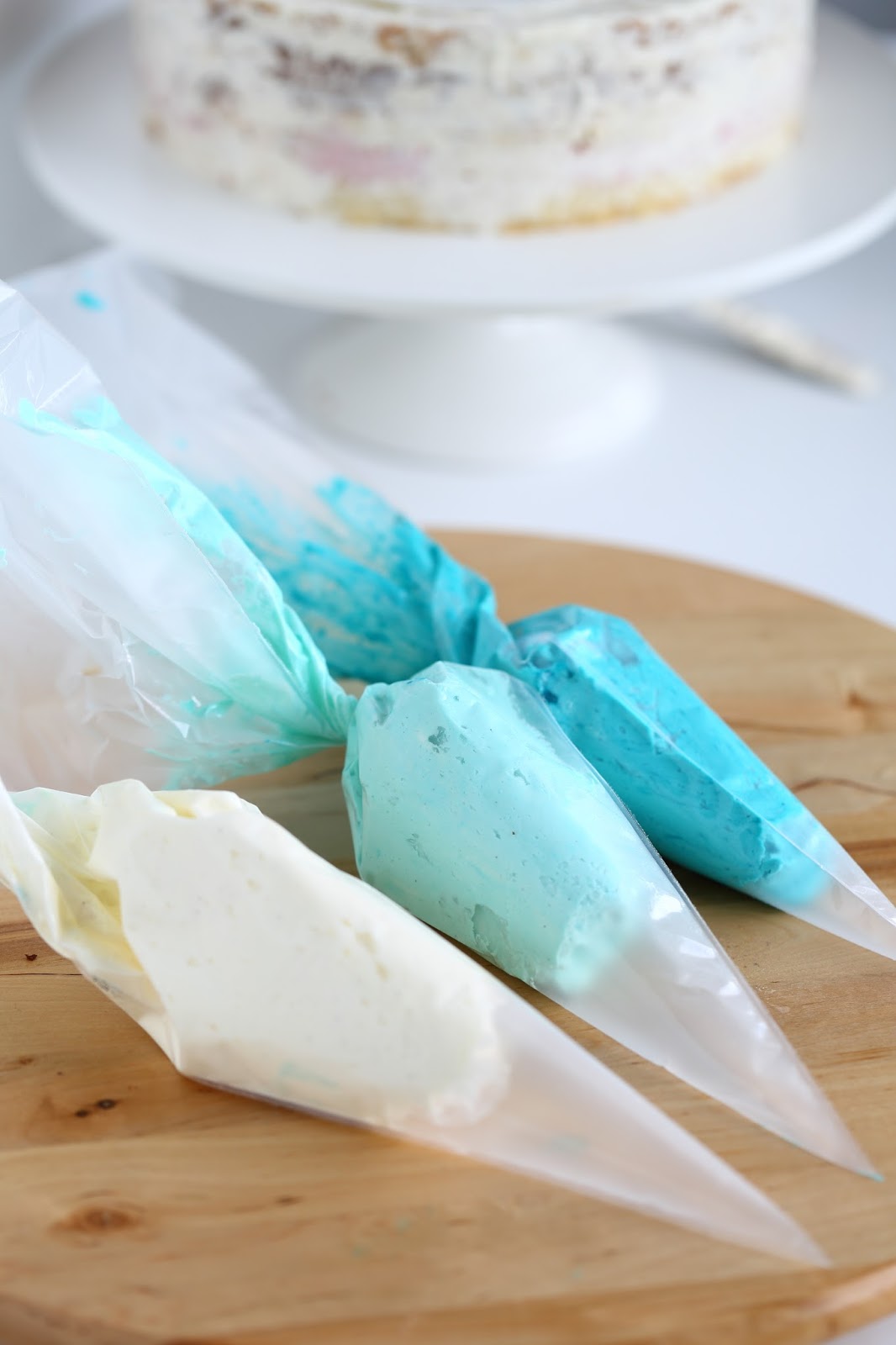 Tee suklaatäyte. Vatkaa kerma löysäksi vaahdoksi. Sekoita joukkoon tuorejuusto, Pilko tumma suklaa mikron kestävään kippoon. Sulata mikrossa varovasti välillä sekoitellen. Kaada sulatettu tumma suklaa moussen päälle ja hurauta nopeasti kunnolla sekaisin. Laita suklaamousse kakun toiseen väliin. Hyydytä kakkua jääkaapissa vähintään 6 tuntia ja poista vuoan reunaosa. Vatkaa kuorrutusta varten kerma vaahdoksi. Vatkaa joukkoon myös notkistettu vispikerma. Levitä ohut murukerros kakun päälle. Jaa sen jälkeen loput kermavaahdosta neljään kulhoon. Värjää yksi niistä vaalean turkoosiksi ja toinen astetta tummemman turkoosiksi. Jätä kolmas valkoiseksi. Lusikoi kermat kolmeen eri (kertakäyttö)pussiin ja leikkaa päihin n. 1 cm reiät (tai käytä pyöreää n. 1 cm tyllaa pusseissa).