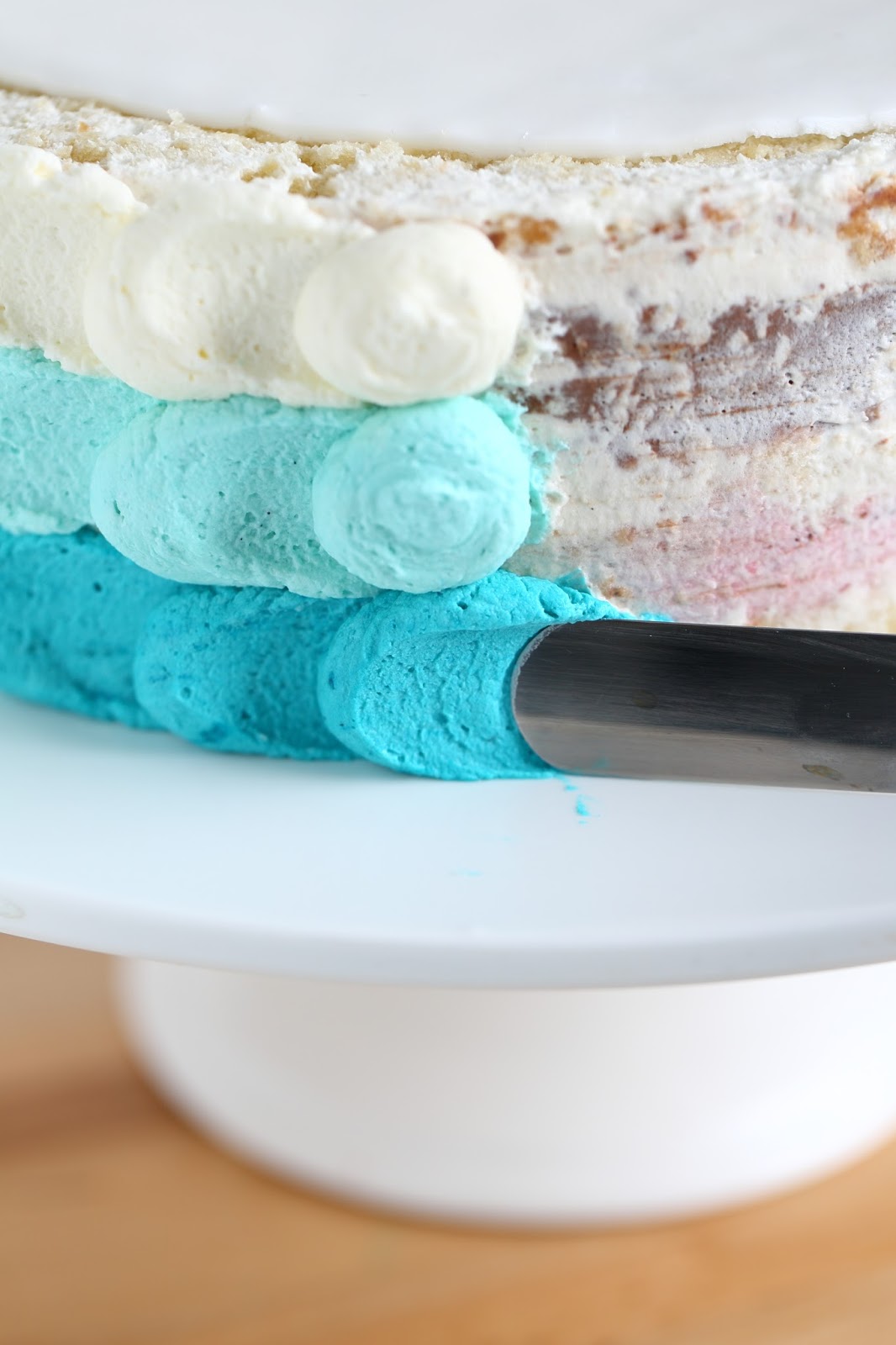 Itselläni tosin kerma ei ollut pursotukseen täydellistä. Ensinnäkin sitä oli liian vähän, enkä laittanut palluroita niin lähelle toisiaan, kuin olisin halunnut. Näin kerma riitti niukin naukin koko kakkuun. Sitten vielä tuo vähäinenkin kerma meni vatkausvaiheessa liian rakeiseksi. Käytin laktoositonta vispikermaa ja käsissäni tuo tuppaa vatkautumaan jok’ikinen kerta hitusen liikaa, vaikka kuinka varoisin. Lähikuvasta tuon rakeisuuden näkee erityisen hyvin. Siitä näkee myös tosin senkin, ettei kakun yläreuna ole aivan siisti. Tähän on hyvä syykin. Syy löytyy siitä, että pursottaminen on mulle ollut aina hieman hankalaa ( = liian vähän harjoittelua) ja testailin ensin samalla yläreunaan erilaista, laineilevaa pursotusta. Tuo (alla olevassa kuvassa näkyvä) pursotus oli kyllä tosi nätti, mutta olisi ehkä sopinut enemmänkin tytön kakkuun. Lisäksi kakku muistutti jo vähän liikaa sirkusta, kun laitoin päälle vielä elefanttikoristeen.. Lusikoin pursotuksen pois ja kokeilin vielä pari kertaa eri tyylejä. Pakostakin siitä kakku kärsii, kun jatkuvasti ronkitaan 😉 Totesin lopulta, että parree pysyä yksinkertaisessa, jotta nätti ombre-pursotettu reunaosakin pääsee oikeuksiinsa.