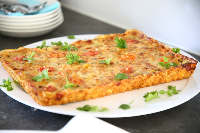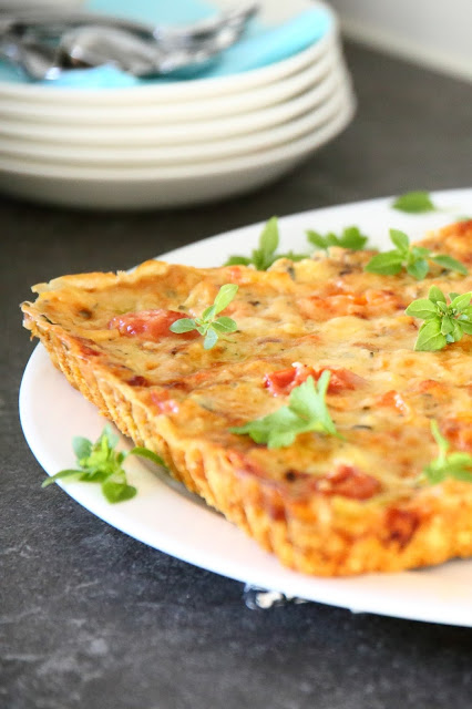 Piirakka syntyi vähän kuin vahingossa hävikkiherkkuna. Samalla kun leivoin tytön kaverisynttäreille feta-kasvispiirakkapaloja, tein pohjataikinaa tupla-annoksen. Toinen puoli taikinasta meni niihin kavereille tarjottuihin kasvispaloihin, ja toisesta tein tämän juustoisen kasvispiirakan pakkaseen valmiiksi odottamaan viikon päästä saapuvia sukulaisia. Koska piirakkataikina tuplaantui extemporee, enkä ollut yhtään etukäteen ehtinyt suunnittelemaan piirakan täytettä. Samalla muistin, että piirakka olisi hyvä tehdä munattomana, mikäli meidän pieni munattomalla ruokavaliolla oleva 1-vuotta täyttänyt synttärisankarikin haluaisi maistaa sitä. Kaivoin esille vuosia sitten tekemäni älyttömän herkullisessa kasvispiirakan ohjeen, jonka täyte hyydytetään ilman munaa, vehnäjauhosuuruksen avulla. Otin mallia tuosta ja muutoin täyte muuttui tällä kertaa kaapin sisällön mukaan paprika- ja kesäkurpitsapainotteiseksi.