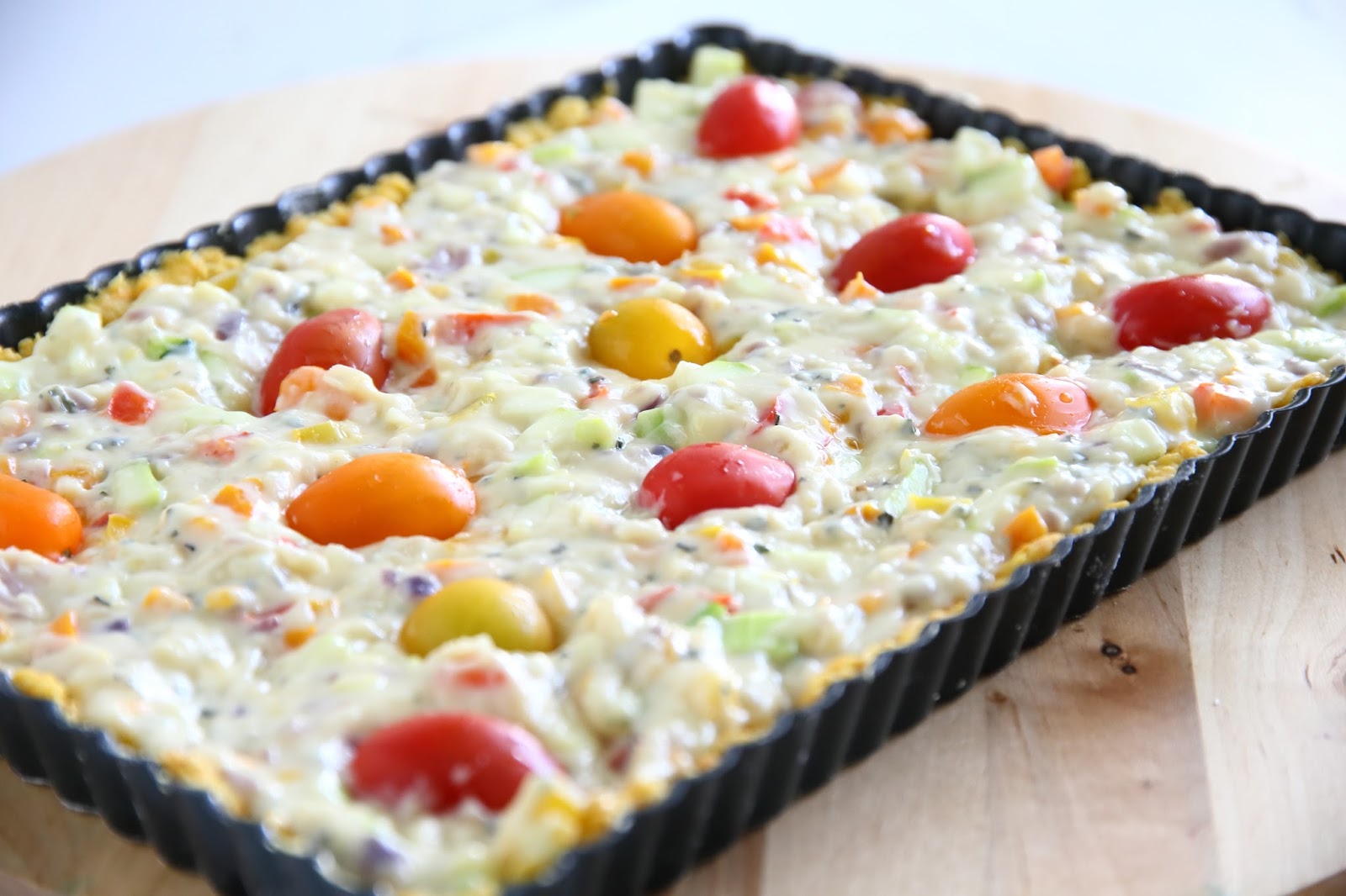 Piirakka syntyi vähän kuin vahingossa hävikkiherkkuna. Samalla kun leivoin tytön kaverisynttäreille feta-kasvispiirakkapaloja, tein pohjataikinaa tupla-annoksen. Toinen puoli taikinasta meni niihin kavereille tarjottuihin kasvispaloihin, ja toisesta tein tämän juustoisen kasvispiirakan pakkaseen valmiiksi odottamaan viikon päästä saapuvia sukulaisia. Koska piirakkataikina tuplaantui extemporee, enkä ollut yhtään etukäteen ehtinyt suunnittelemaan piirakan täytettä. Samalla muistin, että piirakka olisi hyvä tehdä munattomana, mikäli meidän pieni munattomalla ruokavaliolla oleva 1-vuotta täyttänyt synttärisankarikin haluaisi maistaa sitä. Kaivoin esille vuosia sitten tekemäni älyttömän herkullisessa kasvispiirakan ohjeen, jonka täyte hyydytetään ilman munaa, vehnäjauhosuuruksen avulla. Otin mallia tuosta ja muutoin täyte muuttui tällä kertaa kaapin sisällön mukaan paprika- ja kesäkurpitsapainotteiseksi.