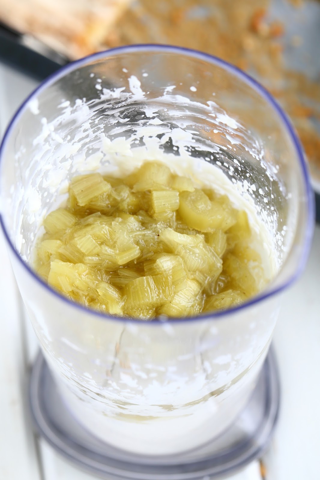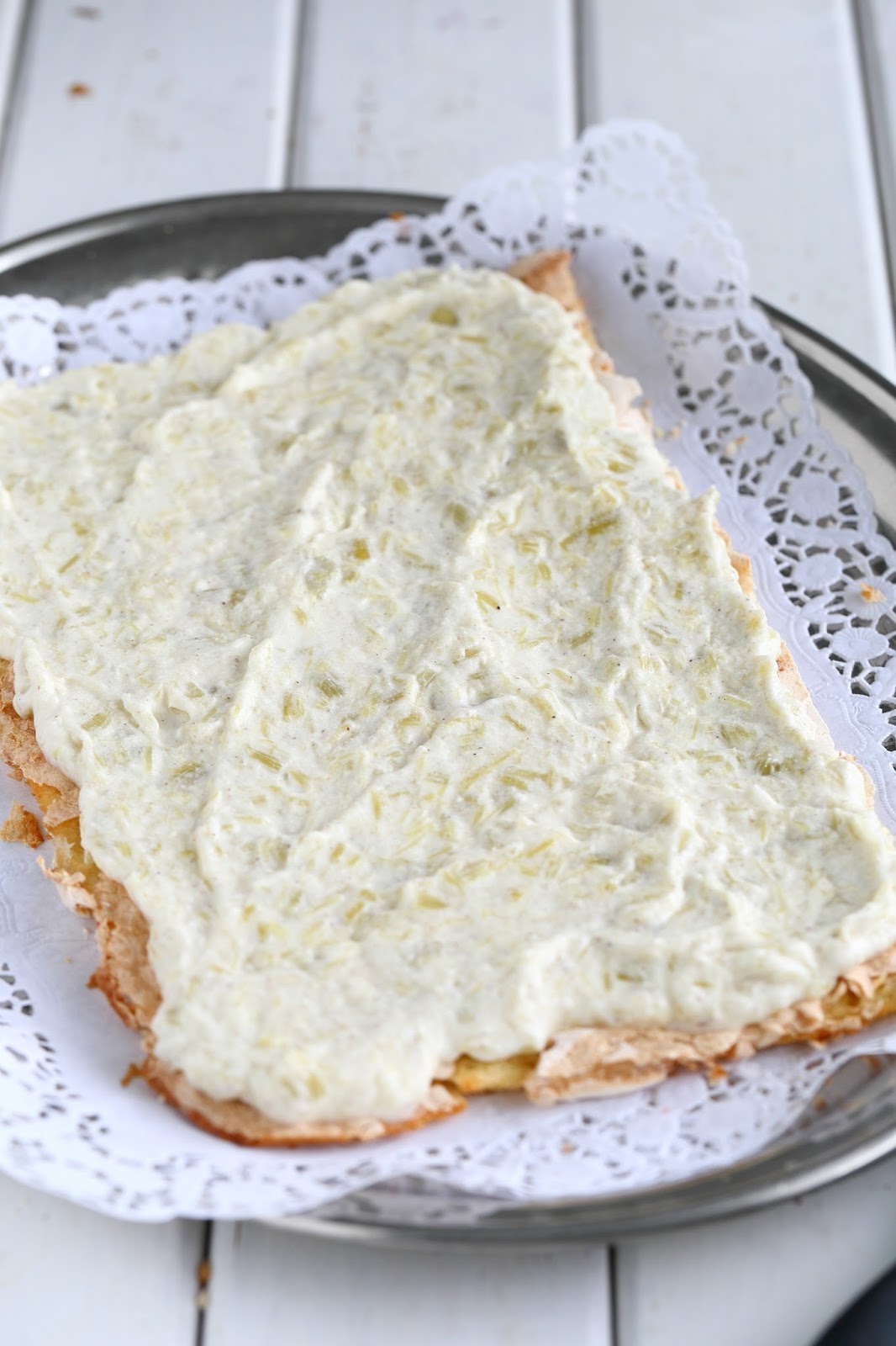Maista ja lisää hieman kanelia. Levitä raparperikerma tarjoilulautaselle olevan pohjan päälle.