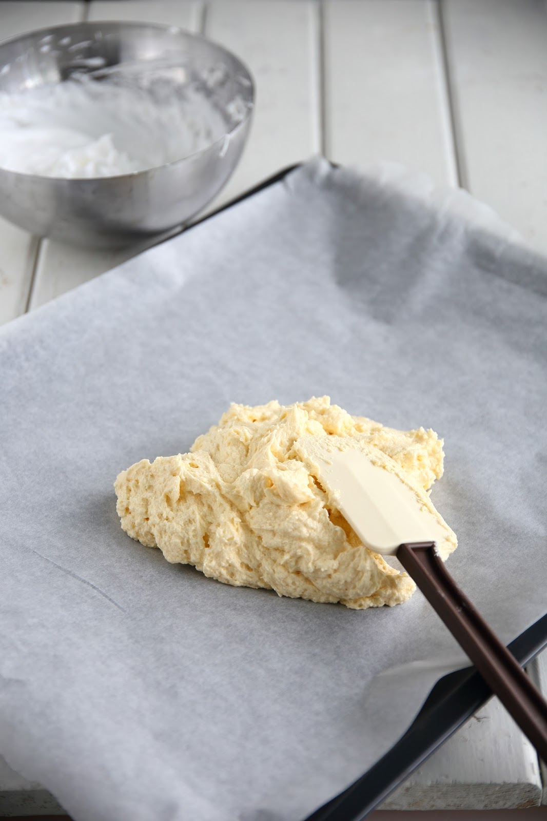 Tee britakakun pohja. Vatkaa huoneenlämpöinen voi ja sokerit vaahdoksi. Erottele keltuaiset ja valkuaiset. Laita valkuaiset toiseen, tyhjään vatkauskulhoon odottamaan vuoroaan. Lisää keltuaiset yksitellen voi-sokeri-vaahtoon voimakkaasti vatkaten. Sekoita keskenään jauhot ja vaniljasokeri. Lisää ne vuorotellen maidon kanssa voi-sokeri-muna-seokseen. Aloita ja lopeta jauhoilla. Älä vaivaa taikinaa. Levitä taikina leivinpaperin päälle pellille ohueksi kerrokseksi. Taikina riittää kyllä, vaikka sitä on vähän.