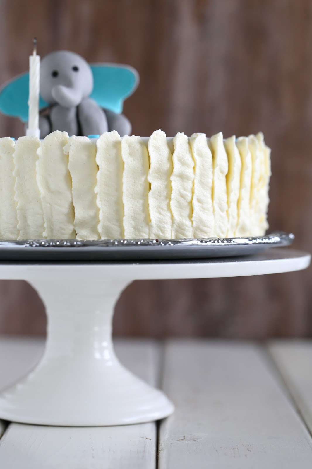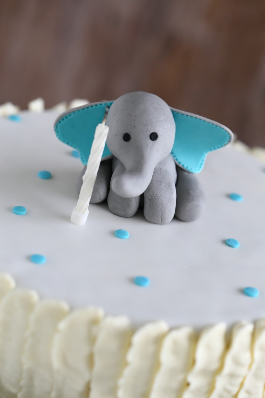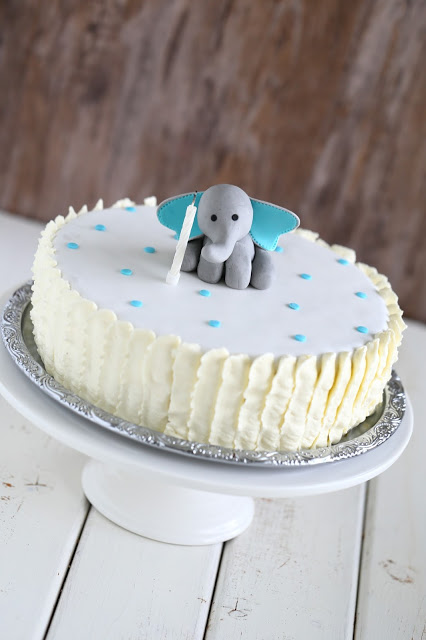 Meidän 1-vuotiaan pojan ja 8-vuotiaan tytön yhteissynttäreitä vietettiin kahteen otteeseen. Tässä oli sekä hyvät että huonot puolensa. Hyviä puolia oli se, että pääsi leipomaan enemmän erilaisia juttuja, mutta samalla huonona se, etten ehtinyt paneutumaan pääkakkujen tekemiseen niin hyvin kuin olisin halunnut. Molemmille kun piti tehdä omat kakkunsa, kahteen kertaan. Pojan yksivuotiskakkujen päälle päätyikin molemmissa juhlissa tämä sama elefanttikoriste.