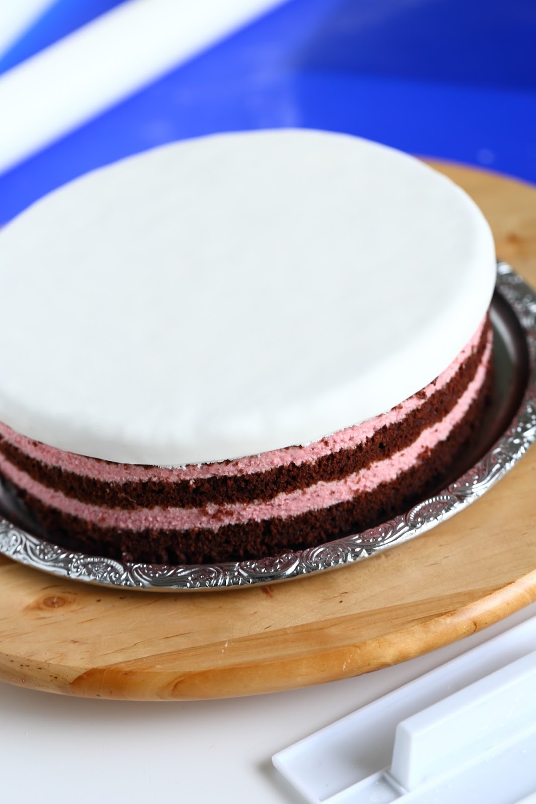 Vatkaa kuorrutetta varten kerma kevyesti vaahdoksi. Vatkaa joukkoon notkistettu tuorejuusto sekä hieman vaniljasokeria. Levitä ohut kerros kakun päälle. Kaulitse päälle kaulintamassasta pyöreä levy.
