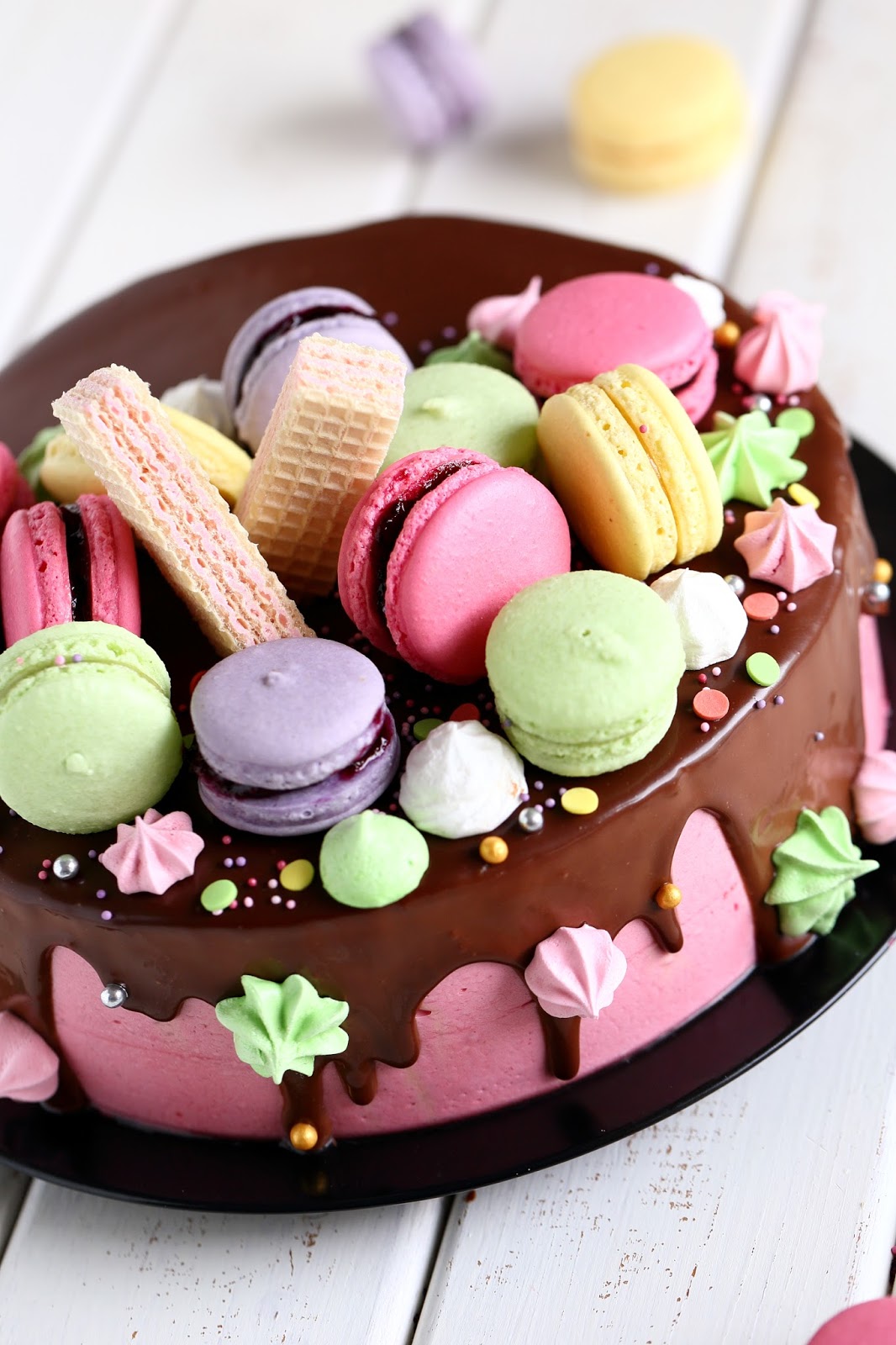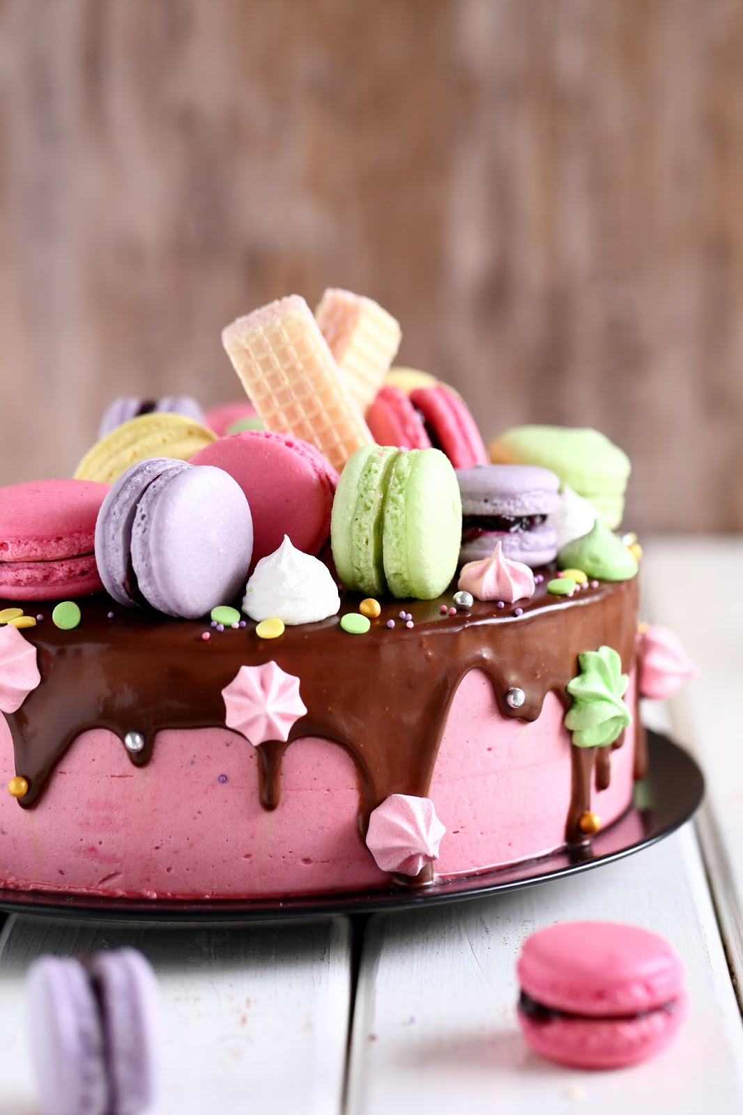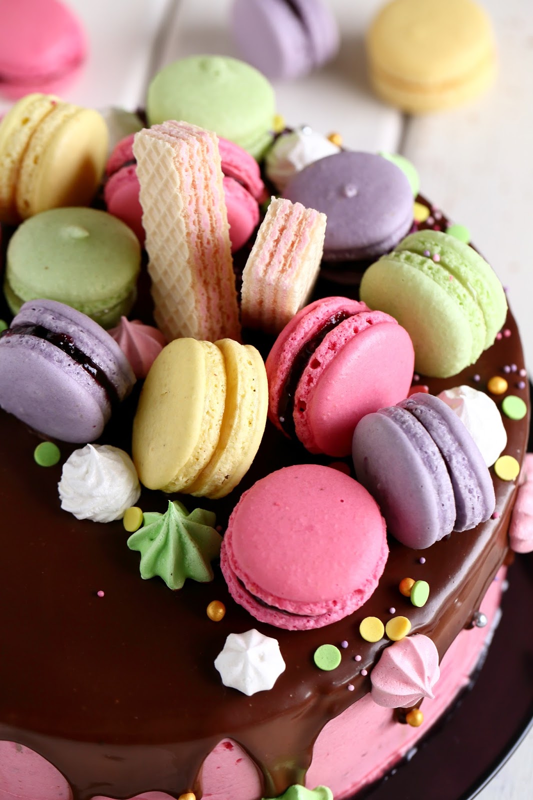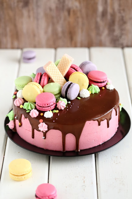 Macaronit ovat ihanan näköisiä pikkutarjottavia kahvipöydässä, mutta niistä saa myös taiottua pirteännäköisen kakun koristelun hetkessä. Meillä tämä värikäs kakku koristi pöytää, kun juhlimme tyttömme 8-vuotissynttäreitä sukulaisten kesken. Tytön toiveena oli värikäs, macaroneilla ja pienillä marengeilla koristeltu kakku, jossa olisi suklaata ja vadelmaa. Tällainen siitä sitten tuli 🙂