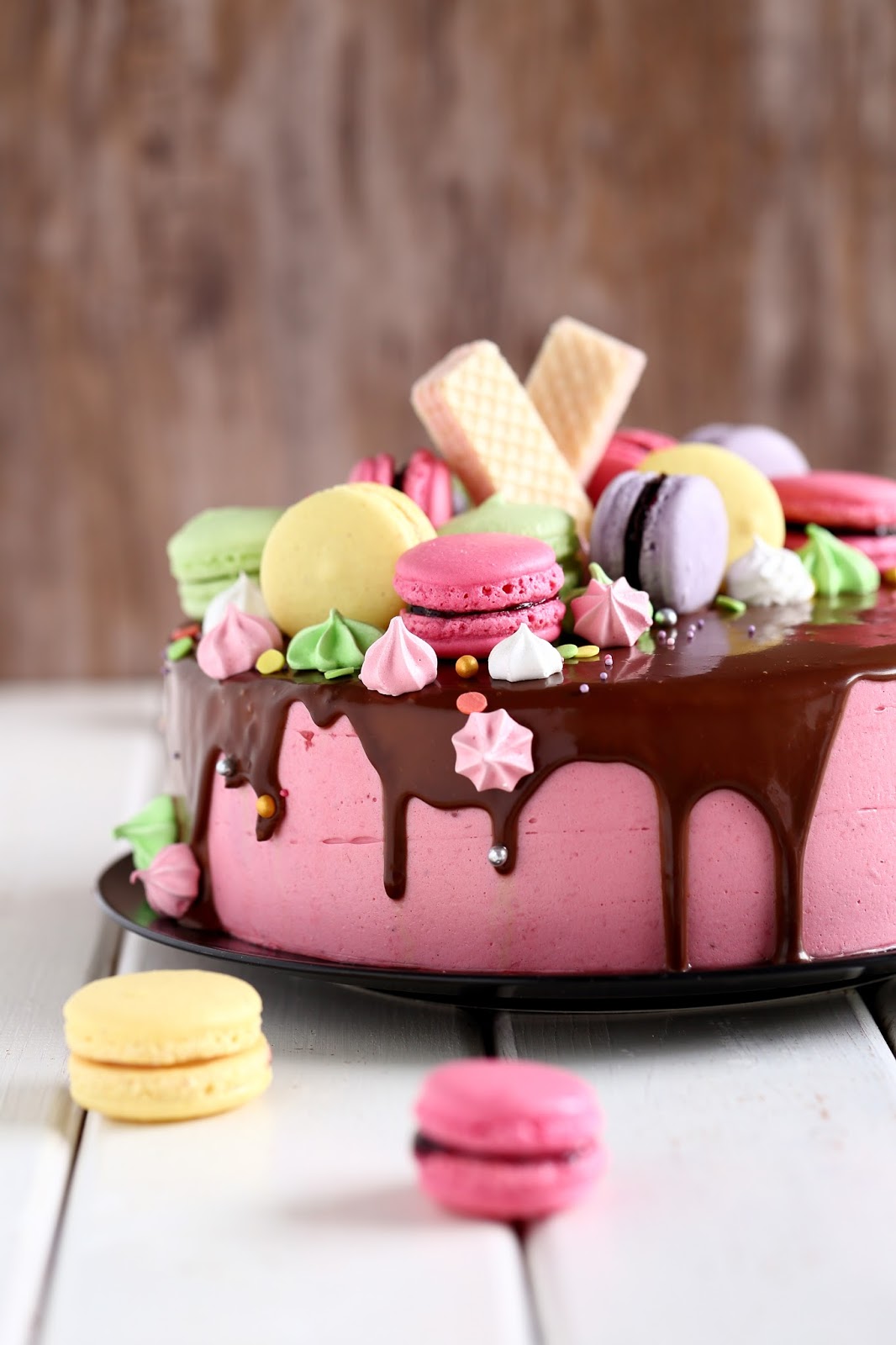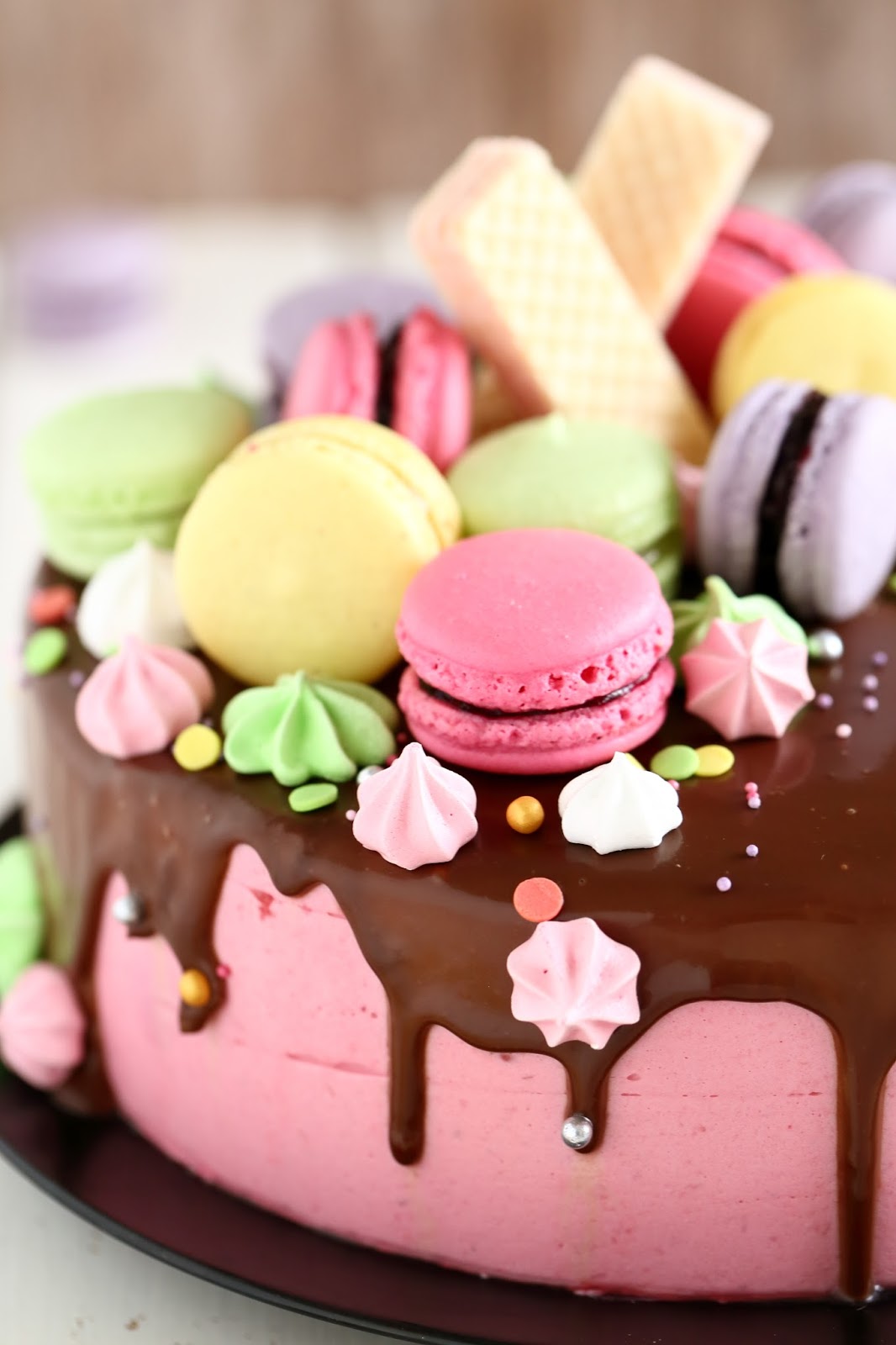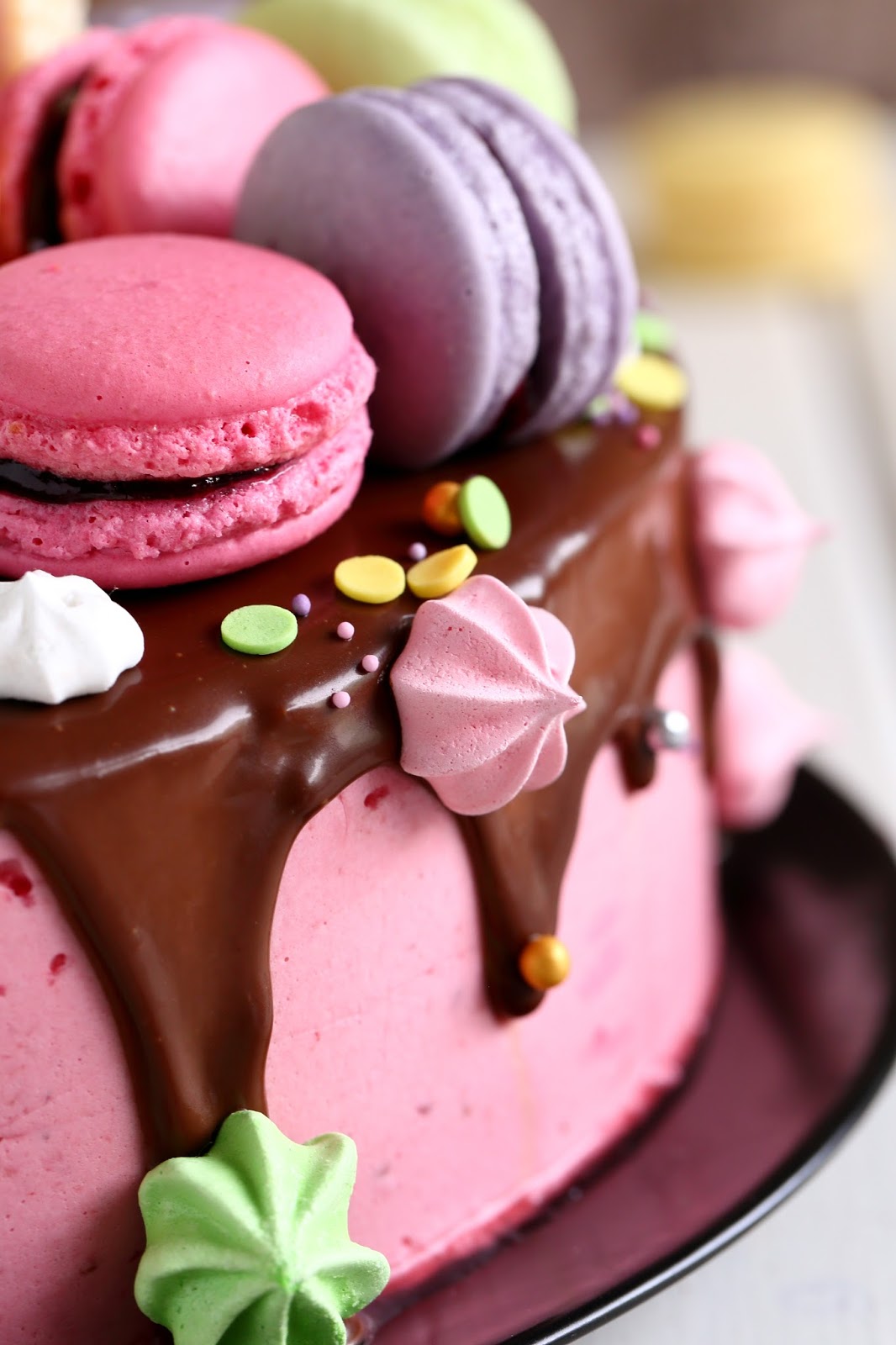 Macaronit ovat ihanan näköisiä pikkutarjottavia kahvipöydässä, mutta niistä saa myös taiottua pirteännäköisen kakun koristelun hetkessä. Meillä tämä värikäs kakku koristi pöytää, kun juhlimme tyttömme 8-vuotissynttäreitä sukulaisten kesken. Tytön toiveena oli värikäs, macaroneilla ja pienillä marengeilla koristeltu kakku, jossa olisi suklaata ja vadelmaa. Tällainen siitä sitten tuli 🙂