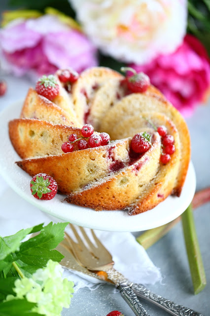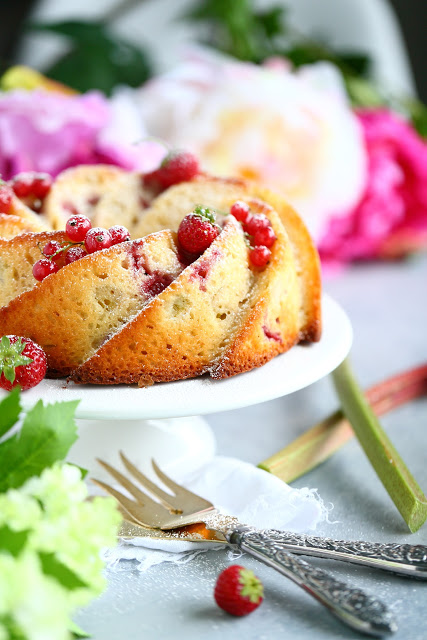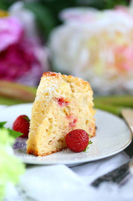 Kakku oli kahvikakkumainen. Melko tiivis, mutta kostea ja mehevä. Kakku oli kuin raparperi-mansikkapiirakka, jossa taikina ja marjat oli sekoitettu keskenään. Mietinkin, voiko tätä edes kakuksi kutsua, mutta muotonsa puolestahan tämä on selvä kakku, kahvikakku. Mansikat ja raparperit toivat kakkuun lisämehukkuutta ja itseasiassa niitä olisi voinut olla enemmänkin. Nyt niitä sattui tulemaan siellä täällä vastaan ja ne olivat juuri parhaimmat kohdat kakussa.