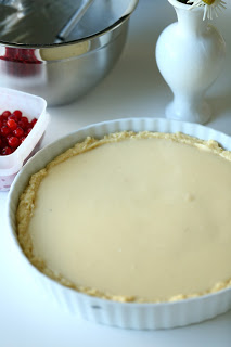 Piirakantekoon kannattaa varata myös halkaisijaltaan vähintään 25 cm oleva korkealaitainen vuoka, jotta täyte pysyy vuoassa myös marjojen lisäämisen jälkeen. Tuota isommassa vuoassa piirakasta tulee matalampi, joten silloin laitojenkaan ei tarvitse olla välttämättä niin korkeat. Mutta suosittelen korkealaitaista vuokaa, sillä silloin pohjaa, täytettä ja marjoja saa yhteen suupalaan sopivan paljon 🙂 Niin ja voihan piirakan tehdä varmaan myös irtopohjavuokaan, mikäli sopivaa piirakkavuokaa ei löydy:)