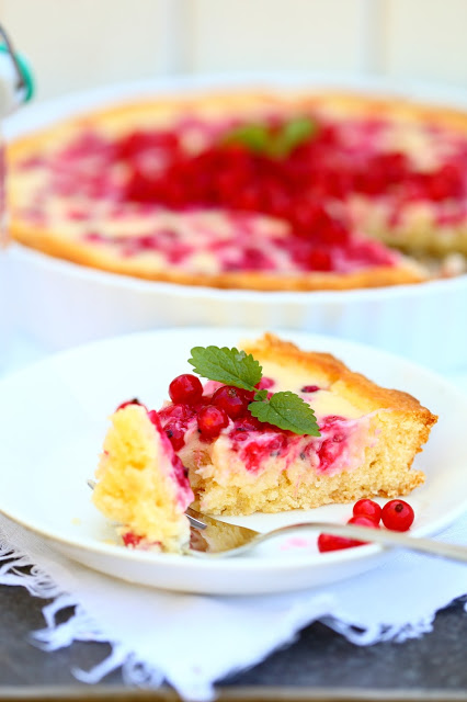 Tai no ehkä piirakassa oli yksi huono puoli. Sen pikaisen katoamisen lisäksi nimittäin. Ja se oli se, että punaherukoita oli aavistuksen hintsusti. Itse laitoin 2.5 dl, mutta huomasin piirakan syömisvaiheessa, että niitä olisi voinut olla enemmänkin. Heittelinkin valmiin, jäähtyneen piirakan päälle punaherukoita vielä lisää ja se toi kivasti kaivattua lisäkirpeyttä. Punaherukoita kannattaakin laittaa piirakkaan oman maun mukaan.
